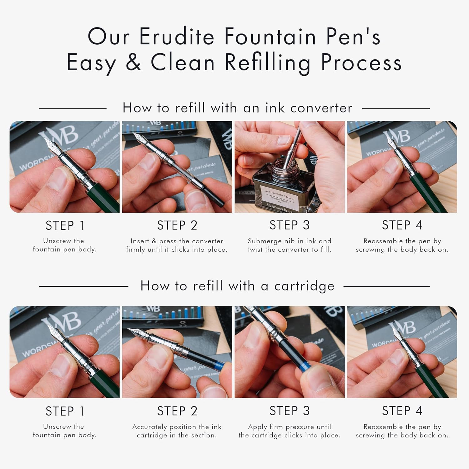- ✒️Discover The All-inclusive Refillable Fountain Pen Set - Includes luxurious fountain pen, ink converter, 24 Pack Ink Cartridges, and a Gift Pouch - ready to be gifted. Each calligraphy ink and fountain pen ink cartridges comes in a plastic re-closable case and will last you at least 2 weeks of regular use. With every order is a complete instruction booklet for your Wordsworth and Black Pen Set. All the information you'll need to get started using and enjoying your luxurious writing tool!