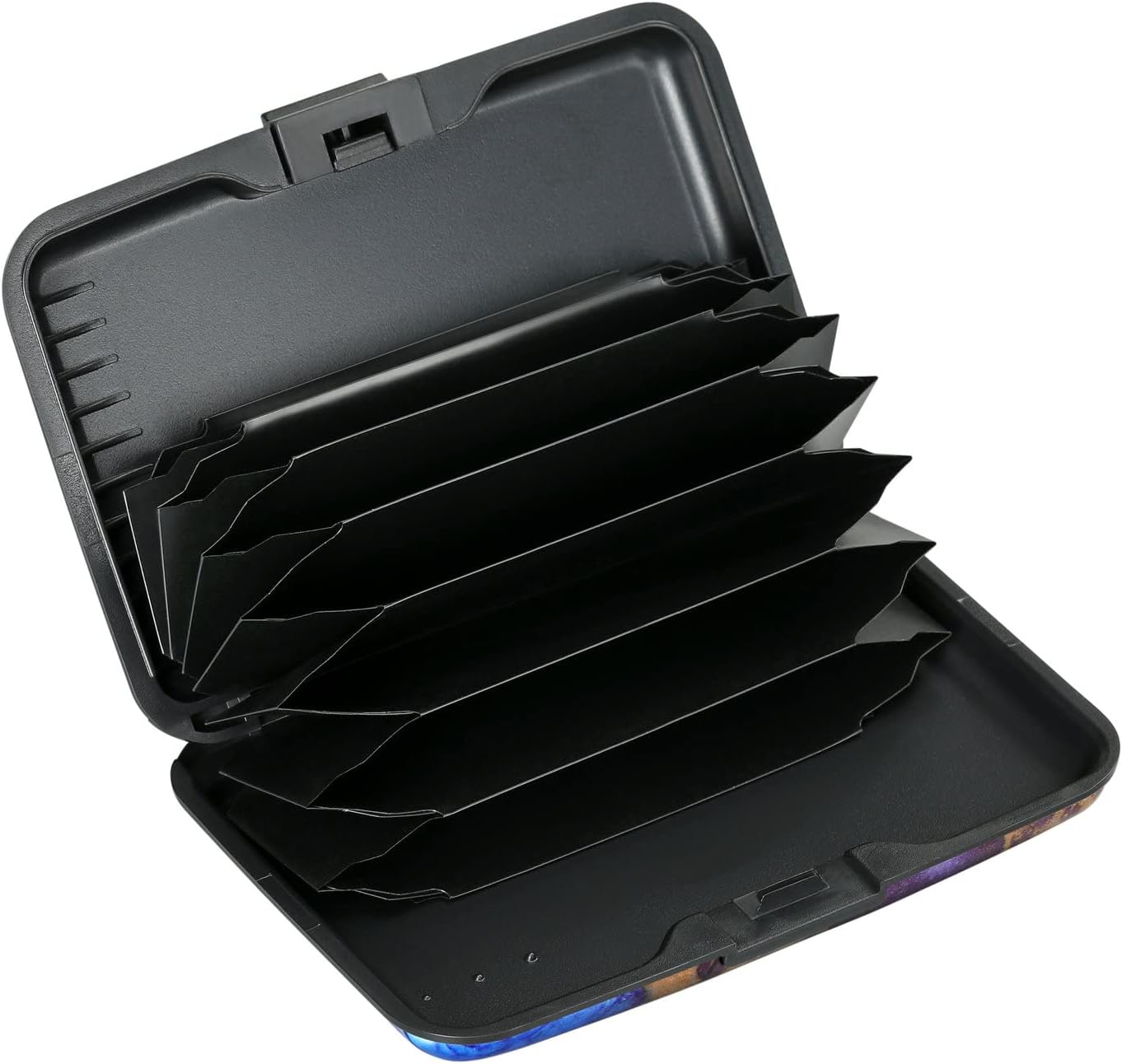 - This credit card holder is made of aluminum shells, ABS plastic frame and clasp closure, RFID-blocking will protect your card data from RFID scanners and readers.