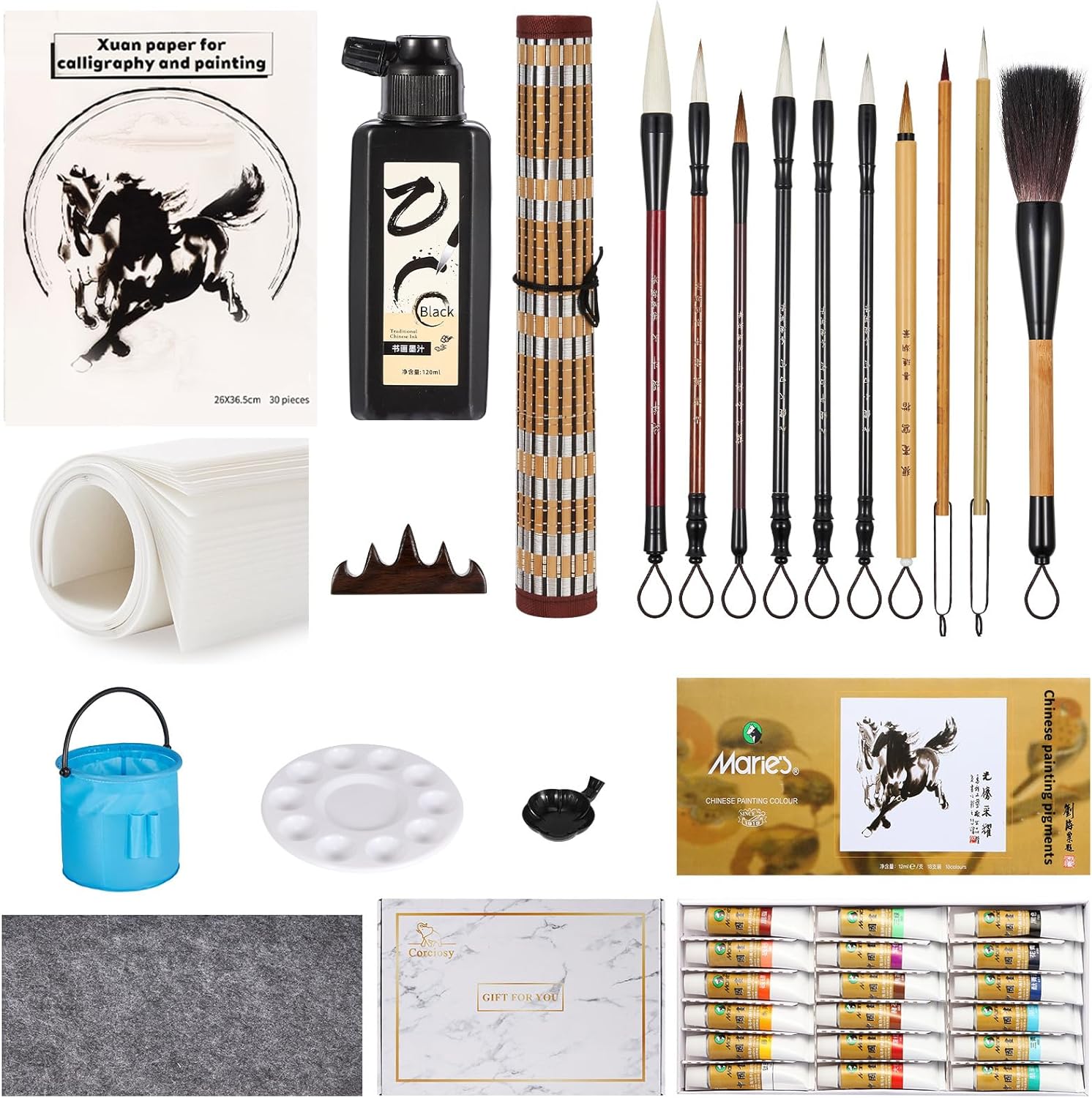 - 【Full Set Included】10 pcs Chinese calligraphy brushes ,1 bamboo roll-up brush holder,1 black liquid ink, 1 wooden brush rest, 30 sheets Chinese calligraphy paper, 1 plastic ink tray, 1 gray felt mat, 1 magic water cloth ,Chinese Painting Color Tubes Big Size Watercolor Set 18 colors, 1 paint tray palettes, 1 folding portable cleaning bucket for your practice