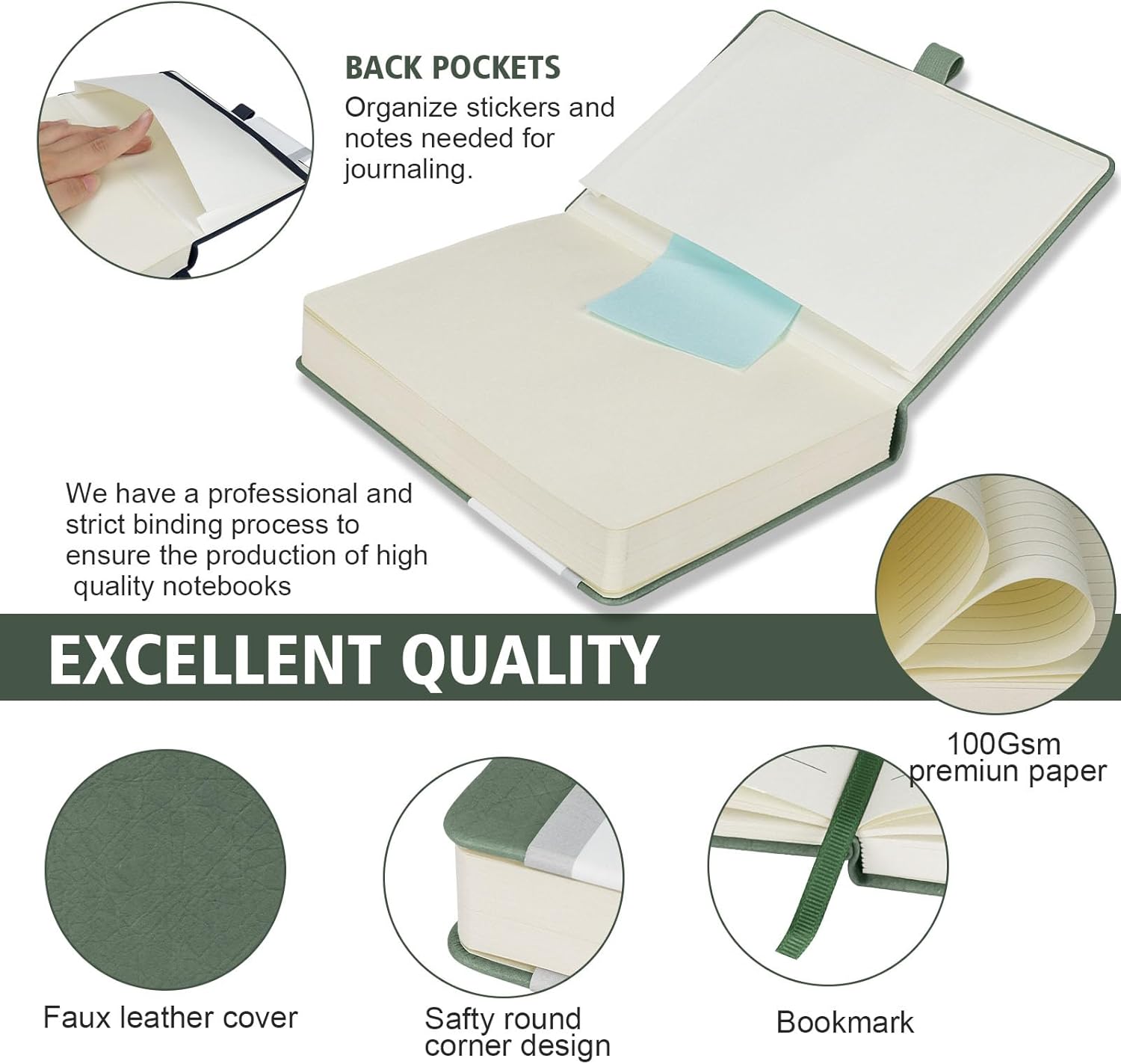 - Humanized Design: ① Ivory paper makes the eyes more comfortable. ② Separate page numbers for easy retrieval The elastic band closure pen holder is suitable for any size of pen. ④ With an inner pocket on the back, it can hold business cards, notes, and other small accessories