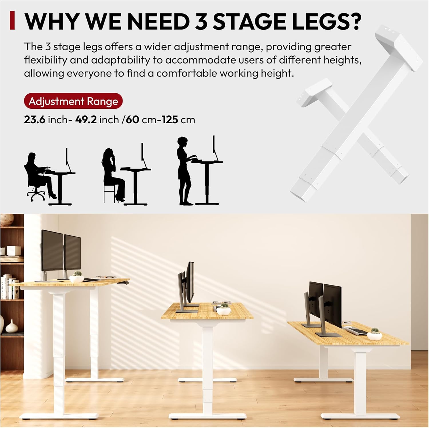 - Adjustable 3-Stage Lifting System for Varied Heights:The 3-stage inverted lifting column provides a discreet and stable lift.Boasts a height range from 23.6β to 49.2β, effortlessly adapting to various height requirements.Enables users to freely switch between standing and sitting positions.