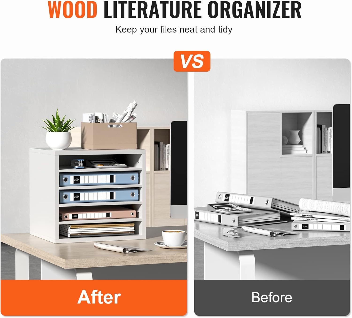 - Maximize Your Space: Say goodbye to cluttered desktops with VEVOR 13.9''x12''x13'' wood literature organizer. It has 5 compartments in total. You'll have ample space to store and organize books, documents, magazines, papers, and other materials. Keep your workspace neat and tidy with ease.