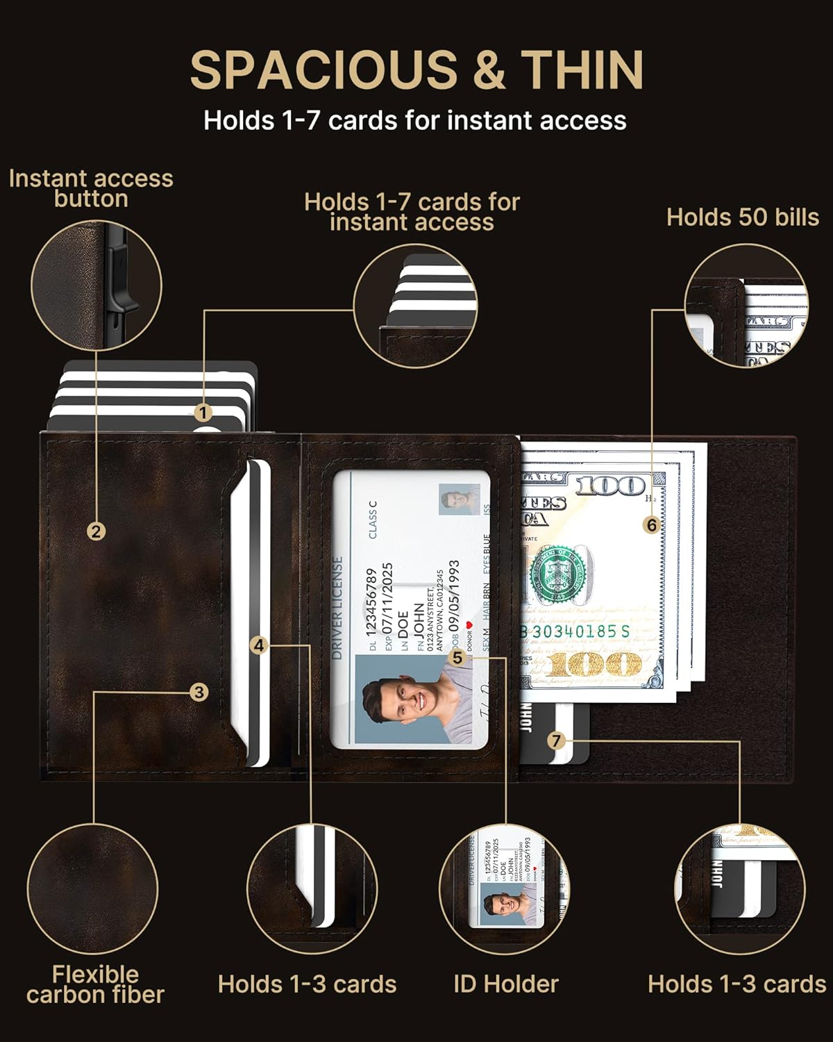 - 【QUICKEST ACCESS】Instant card access at the tap of a button by a single hand. Stores 10-15 cards and 15 bills total. The pop up aluminum card holder stores 6-7, the built-in cash slot stores 15 bills, and the ID window for driver's licenses.