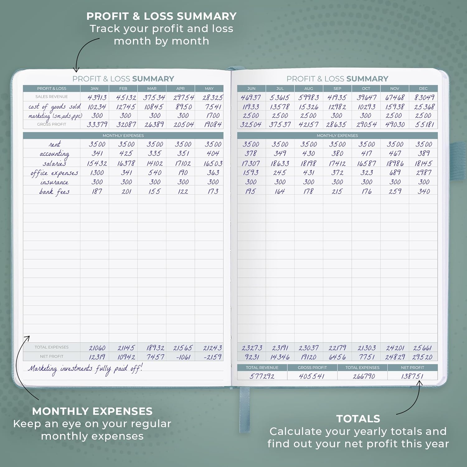 - COMPACT A5 FORMAT & DURABLE DESIGN: This bookkeeping record book comes in A5 format (5.8 by 8.3 inches) and has an eco-leather hardcover, 120gsm no-bleed paper, elastic, pen loop, bookmark, pocket for notes, and a user guide.