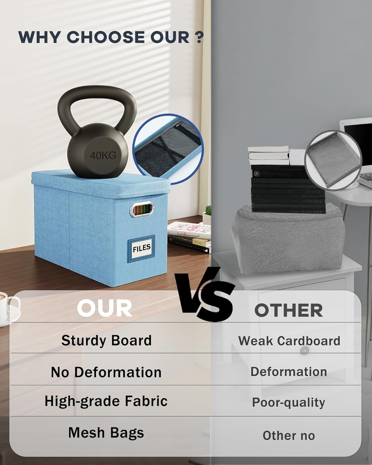 - 【Sturdy & Stackable】Portable storage box is made of well-made linen fabrics and durable material, with good support and bearing capacity, and the box top can withstand 100 lbs. The document boxes can be stacked when in use, or folded for easier storage when not in use.