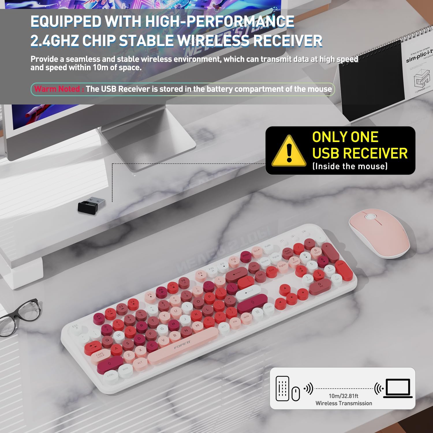 - 【Wireless Keyboard and Mouse Combo】 Includes jar-owl wireless keyboard and mouse with 104 Round Retro Style Keycaps and cute wireless Mouse. Wireless keyboard Size:17.3inchX4.9inchX0.78-1.1inch(Adjustable Height), Cute Mouse Size:4.1inchX2.5InchX1inch.ATTENTION: The CONNECTOR FOR THE PC IS ON THE BACK OF THE MICE.