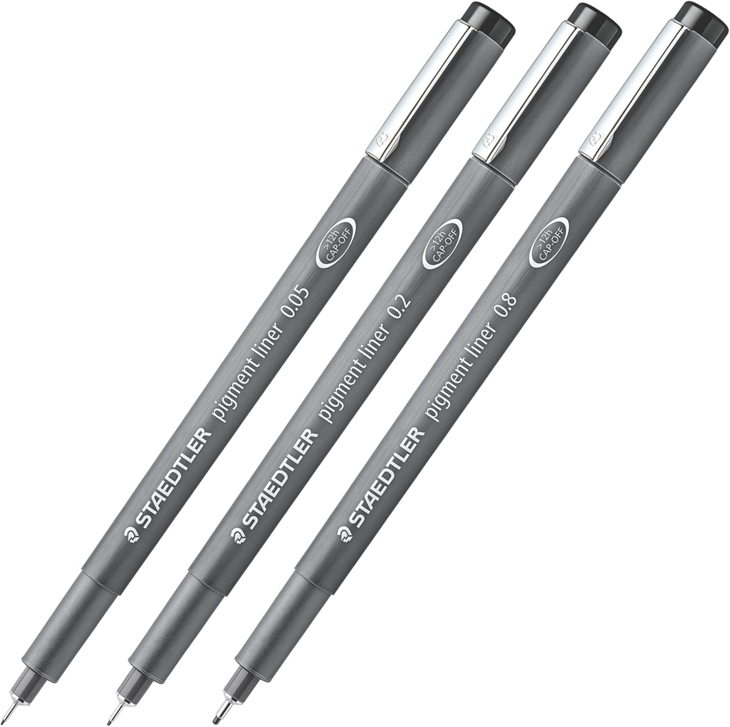 STAEDTLER Pigment Liner Pack, Black, 3 Pens, Assorted Line Widths 0.05mm/0.2mm/0.8mm, 308-9SBK3