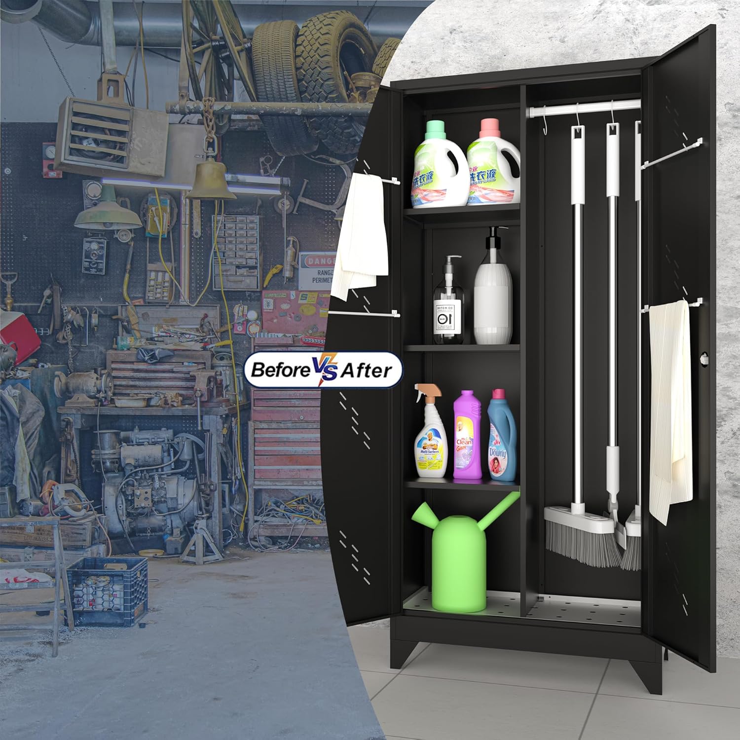 71'' Metal Storage Cabinet with Doors, Multifunctional Bathroom/Garage Lockable Steel Cabinet, Broom Closet Storage with Hanging Rod (Style-1)