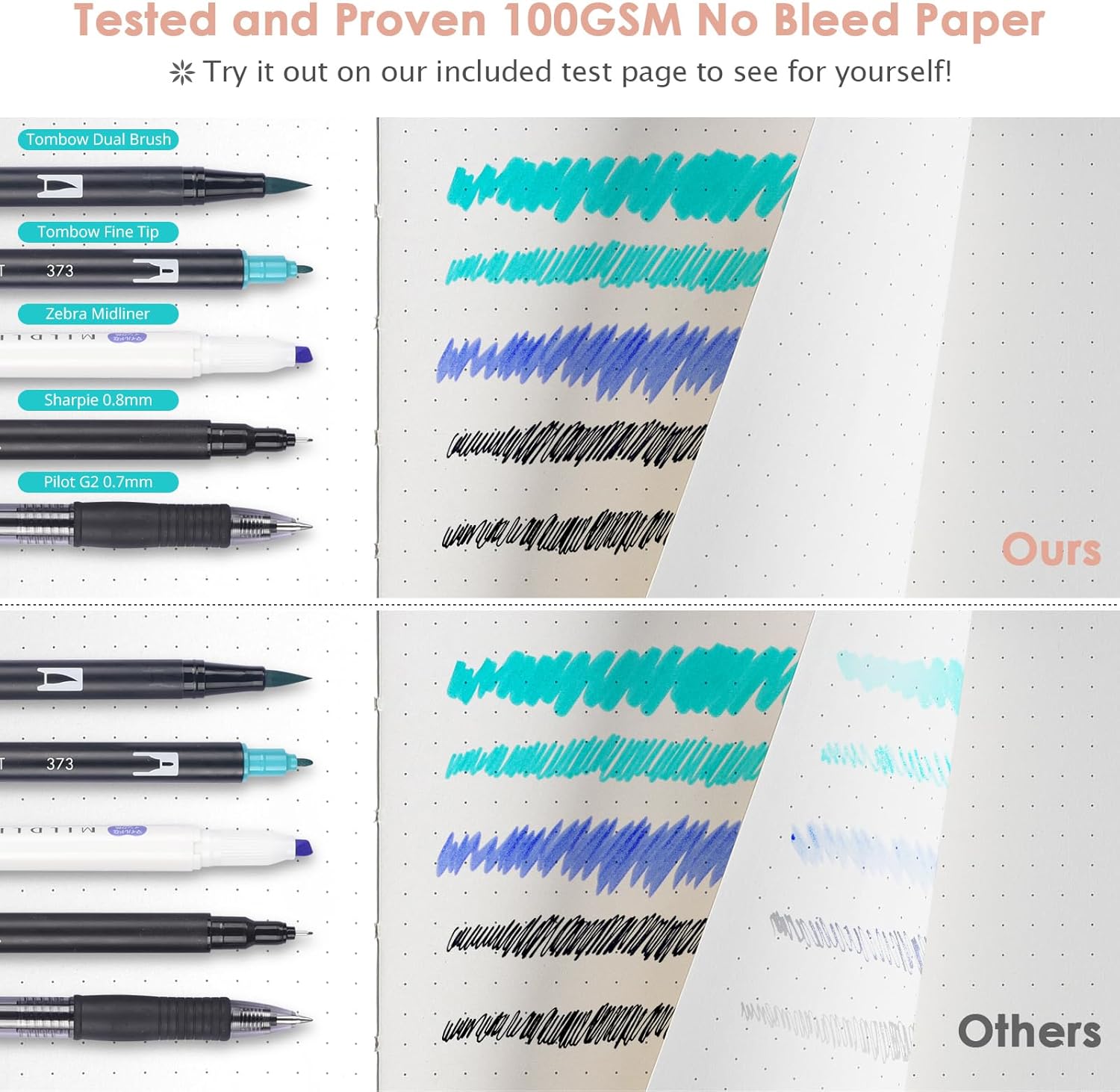 - 【Thick Paper for Writing Without Limits】Large A5 hardcover notebook (5.75"x 8.38"/146mm x 213mm), total 320 pages, includes 312 numbered pages(156 sheets). Each page includes 1107 dots with 5mm spacing: X27*Y41. Our INNOVATIVE PAPER TECHNOLOGY on 100GSM thick paper ensures a perfect canvas for your ideas - no bleed, no ghosting, as confirmed by tests with various pens commonly used in bullet journaling.