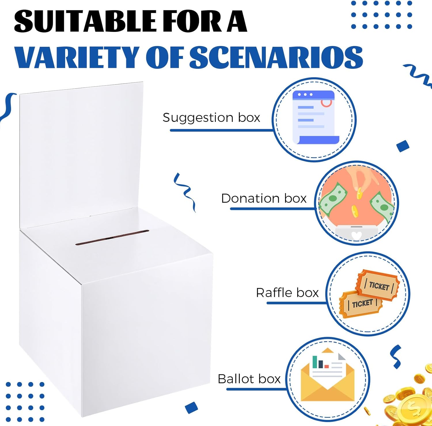- Proper Size for Multiple Uses: measuring about 10 x 10 x 10 inches or 25.4 x 25.4 x 25.4 cm, these tip boxes are ideal for collecting various items, such as ballots, raffle tickets, feedback forms, and suggestions; They are not too big or too small, making them convenient to transport and store