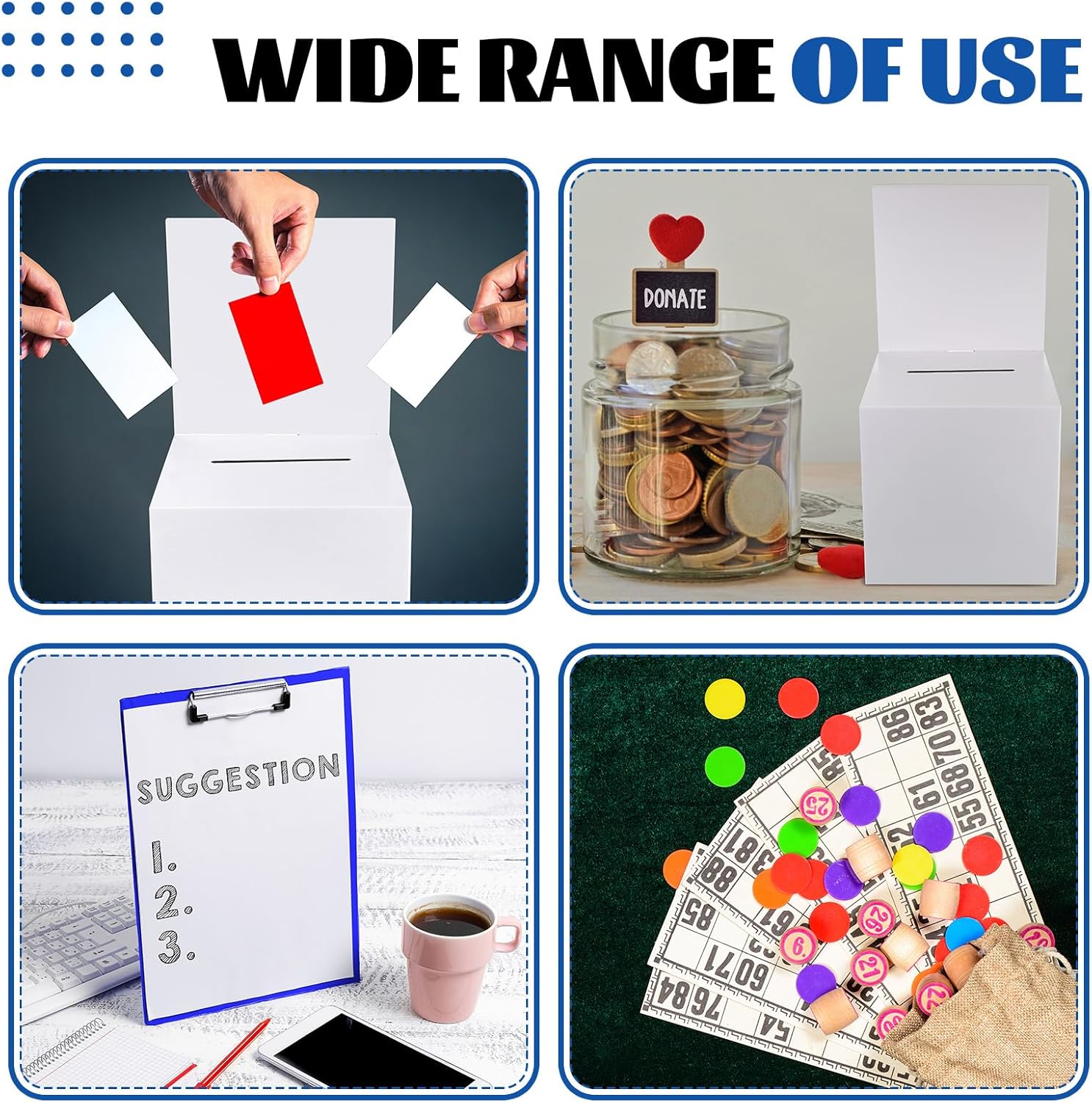 - Widely Applicable for Various Events: these donation boxes for fundraising are versatile and widely applicable for different occasions and events; You can use them for raffles, contests, surveys, feedback collection, and suggestion boxes; They offer an efficient and organized way to collect various items from participants