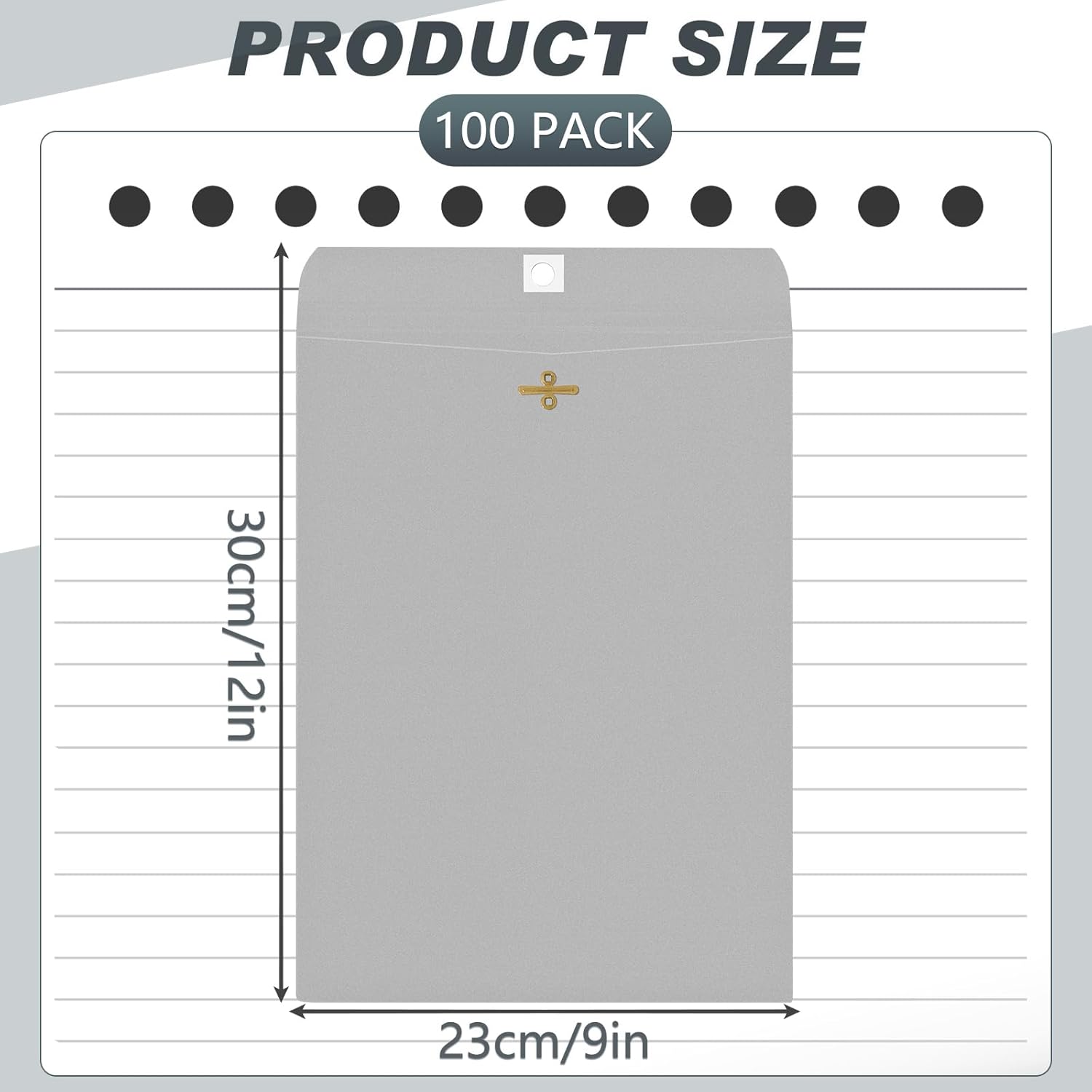 Geyee 100 Pcs Clasp Manilla Envelopes 9 x 12 Inch Gummed Colored Envelopes for Storing or Mailing for Home Office Business Supplies(Grey)