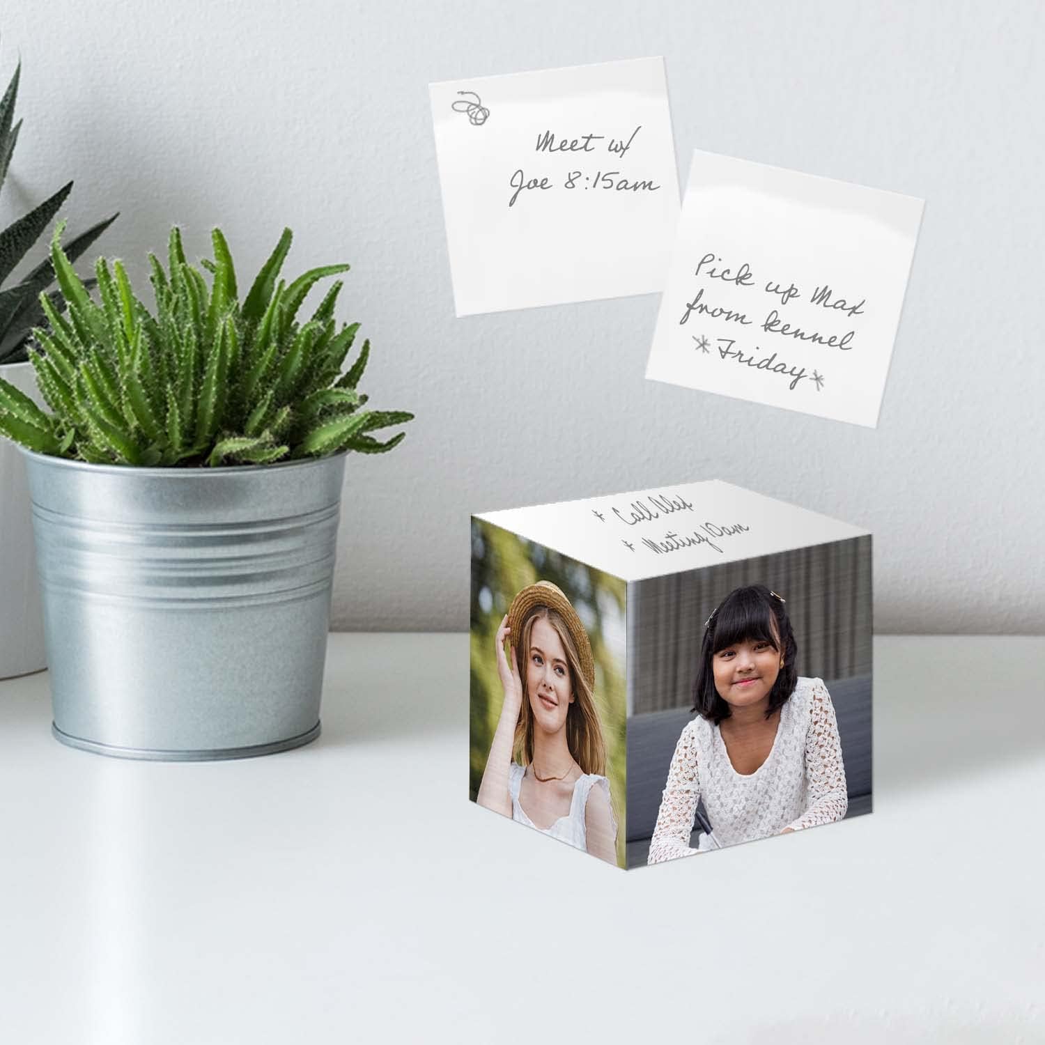 - Includes: 600 repositionable adhesive notes. 2.75" square cube printed full color on all 4 sides. Your own custom photos on each side. Notes are blank white, matte finish for easy and legible writing.