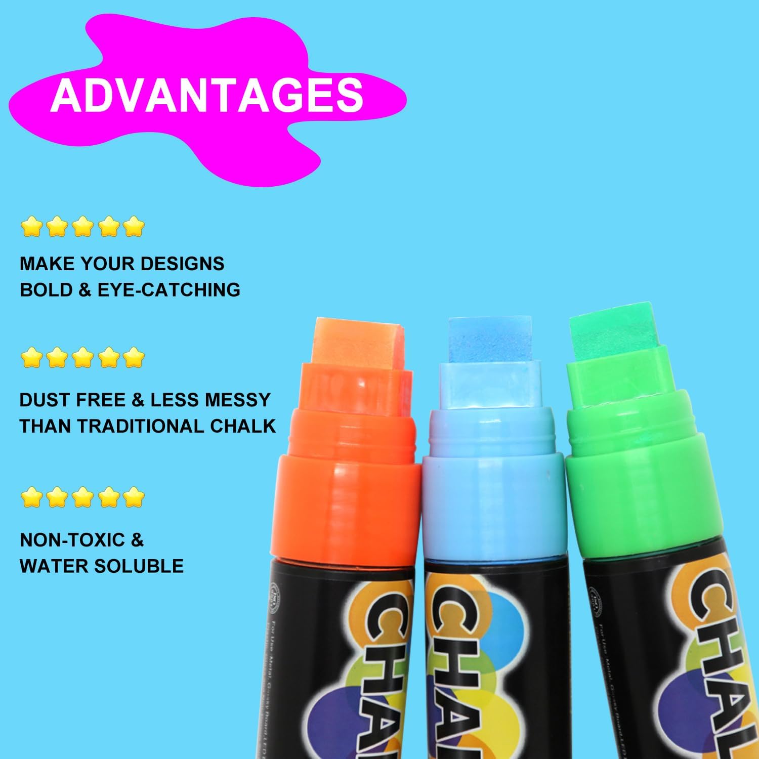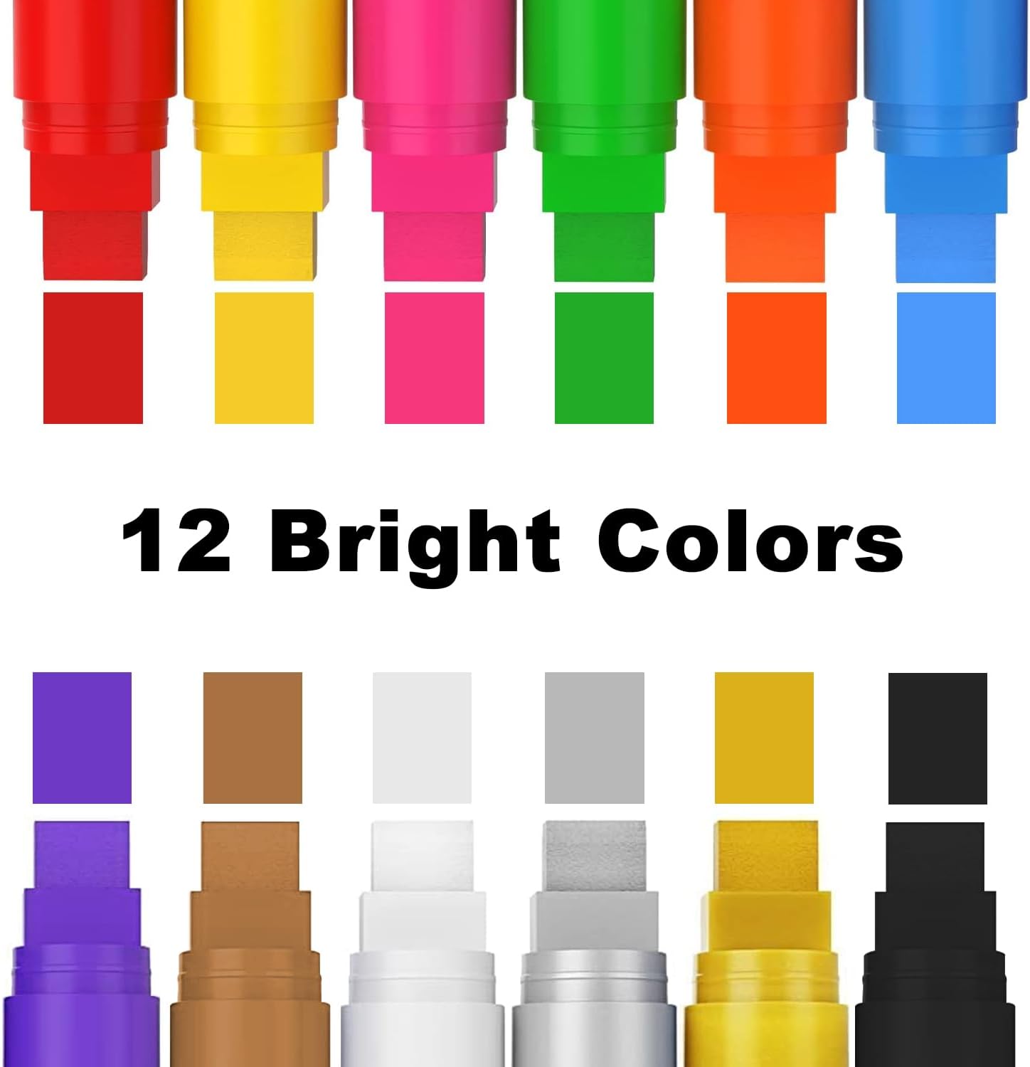 12 Colors Washable Window Markers for Cars, 15mm Jumbo Liquid Chalk Markers, 3 in 1 Nib, Metallic & Neon Paint Glass Pen for Auto, Chalkboard, Blackboard, Bistro, Menus and Any Non-Porous Surface