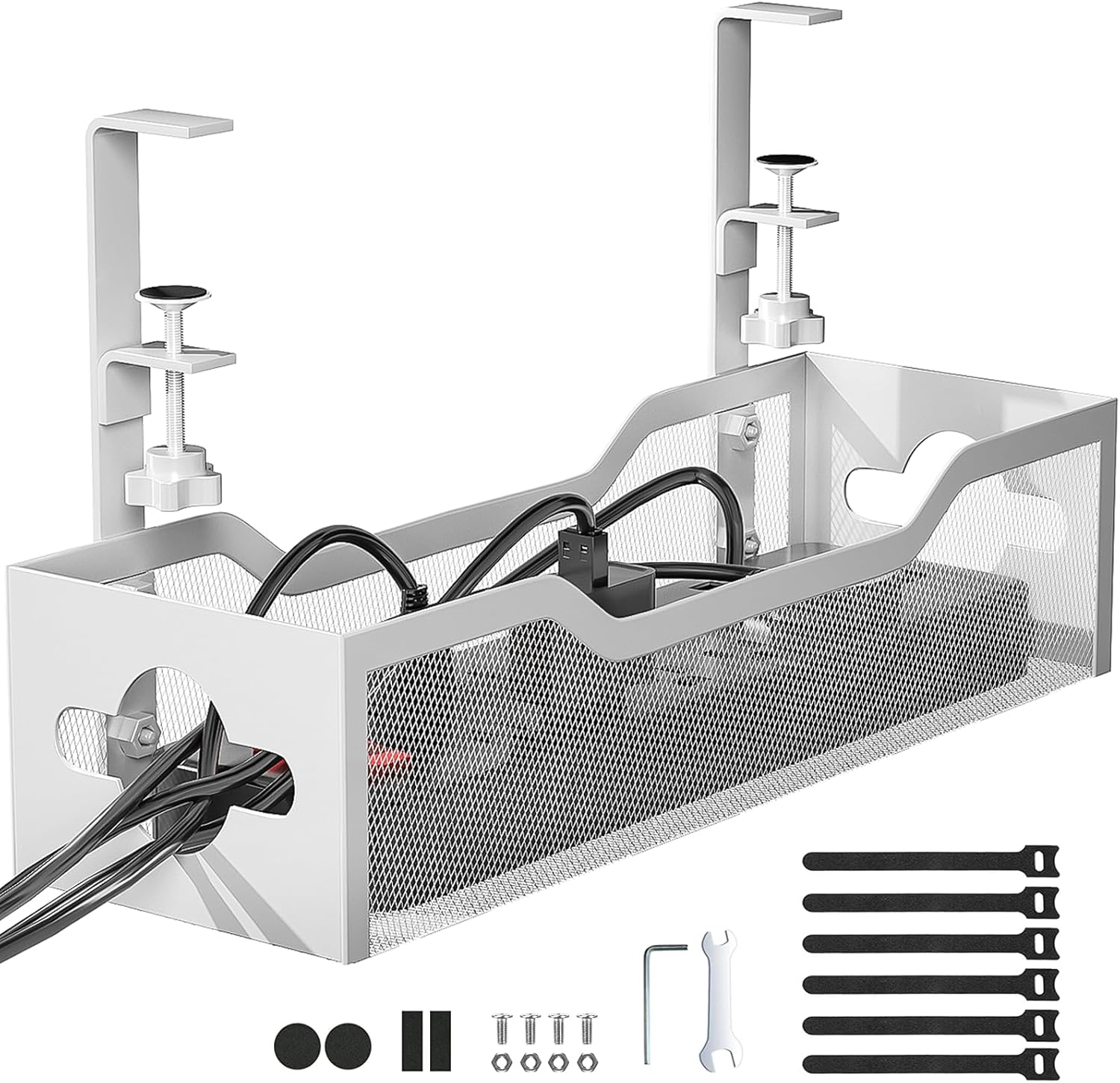 - 【Sturdy and Beautiful】Cord management under desk is made of high-quality carbon steel and holds about 15 lbs. The wire basket has 2 holes on each side of the tray to enable your cables to pass freely. Cable baskets are suitable for desk thickness use from 0.4" to 2".