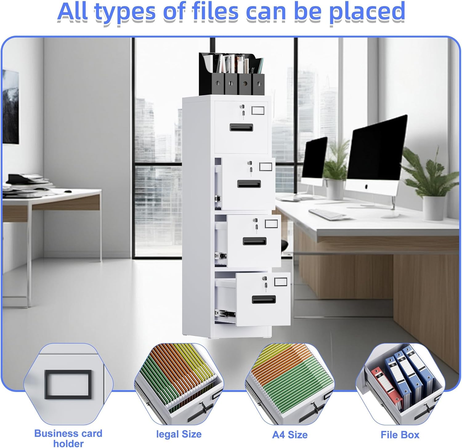- ăLarger and Deeper DrawersăThe 4 drawer file cabinet is larger and deeper than similar ones, each drawer fits practically anywhere for up to 100 hanging folders. Each drawers also equipped with 1 adjustable hanging rails , which can perfectly store letters, legal, A4 or F4 size folders to meet your different needs.