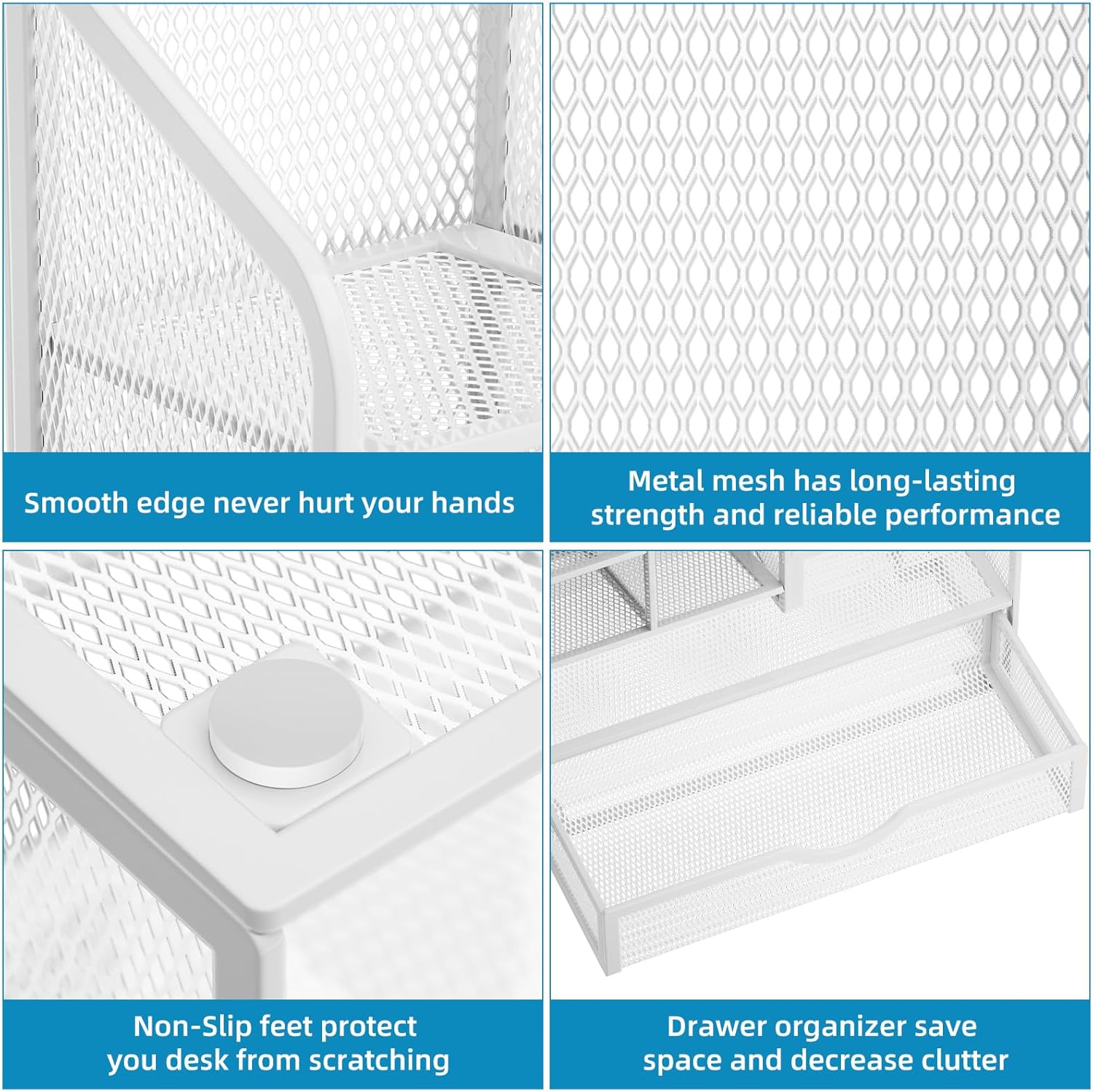 - 【STURDY AND DURABLE】: The desk storage is made of high-quality metal mesh and built with non-skid feet to make it incredibly stable, which is not easy to get rusty and thereby, keeping the pen holder brand new all the time. The extremely smooth edges will not hurt your things or yourself. for meeting all your demands for home and office use.
