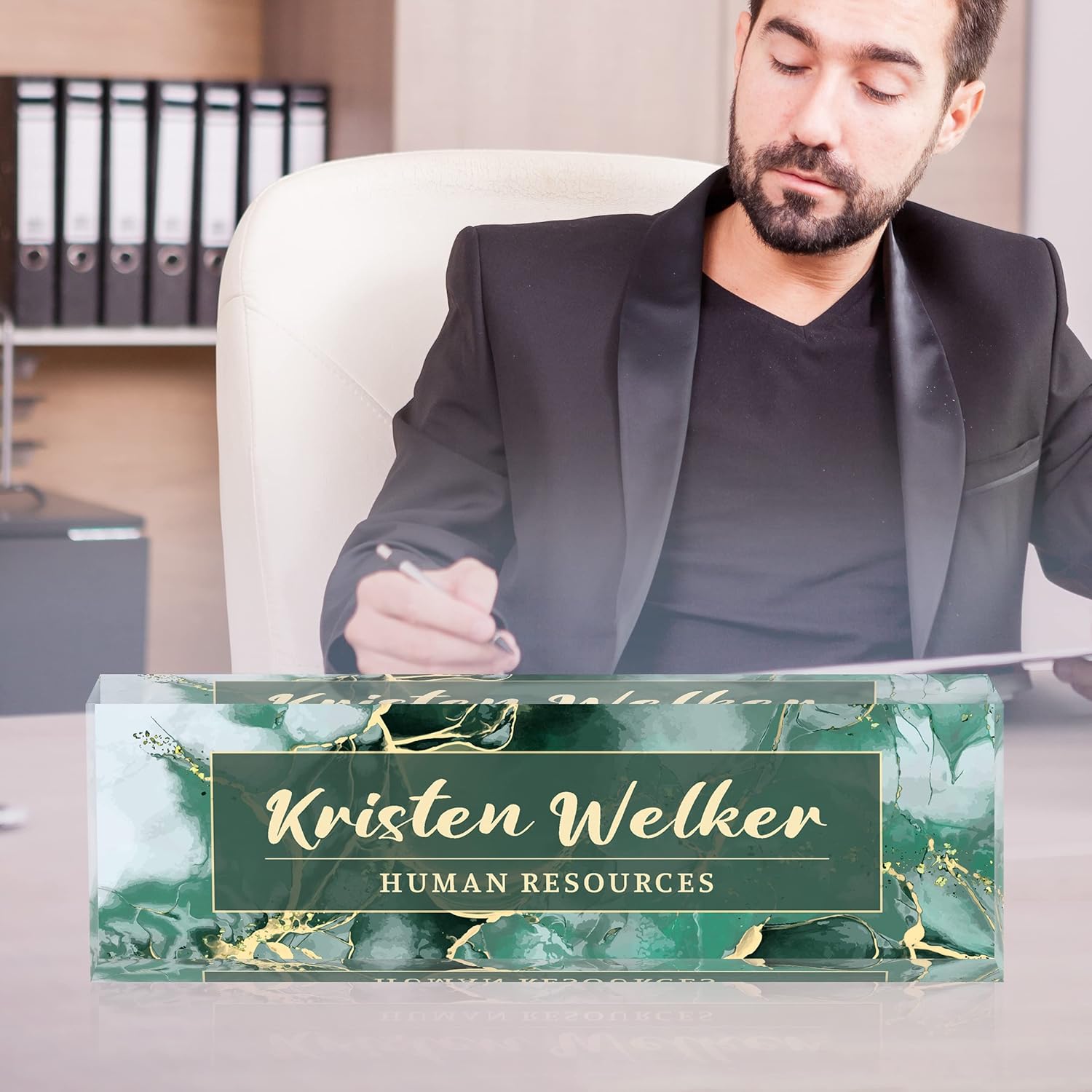 Desk Name Plate Personalized, Premium Green Phnom Penh Marble Acrylic Desk Name Plate, Personalized Name Plate for Desk, Office Decor for Women or Men Coworkers, Boss, Employee, Teacher