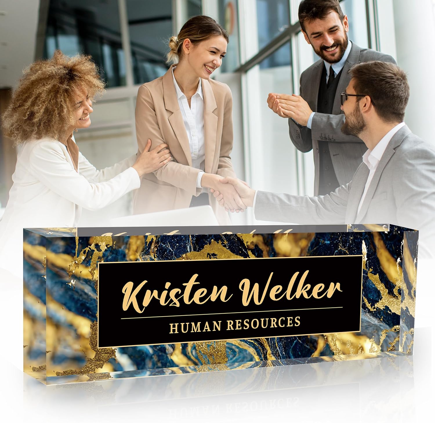 Desk Name Plate Personalized, Premium Black Gold Marble Acrylic Desk Name Plate, Personalized Name Plate for Desk, Office Decor for Women or Men Coworkers, Boss, Employee, Teacher