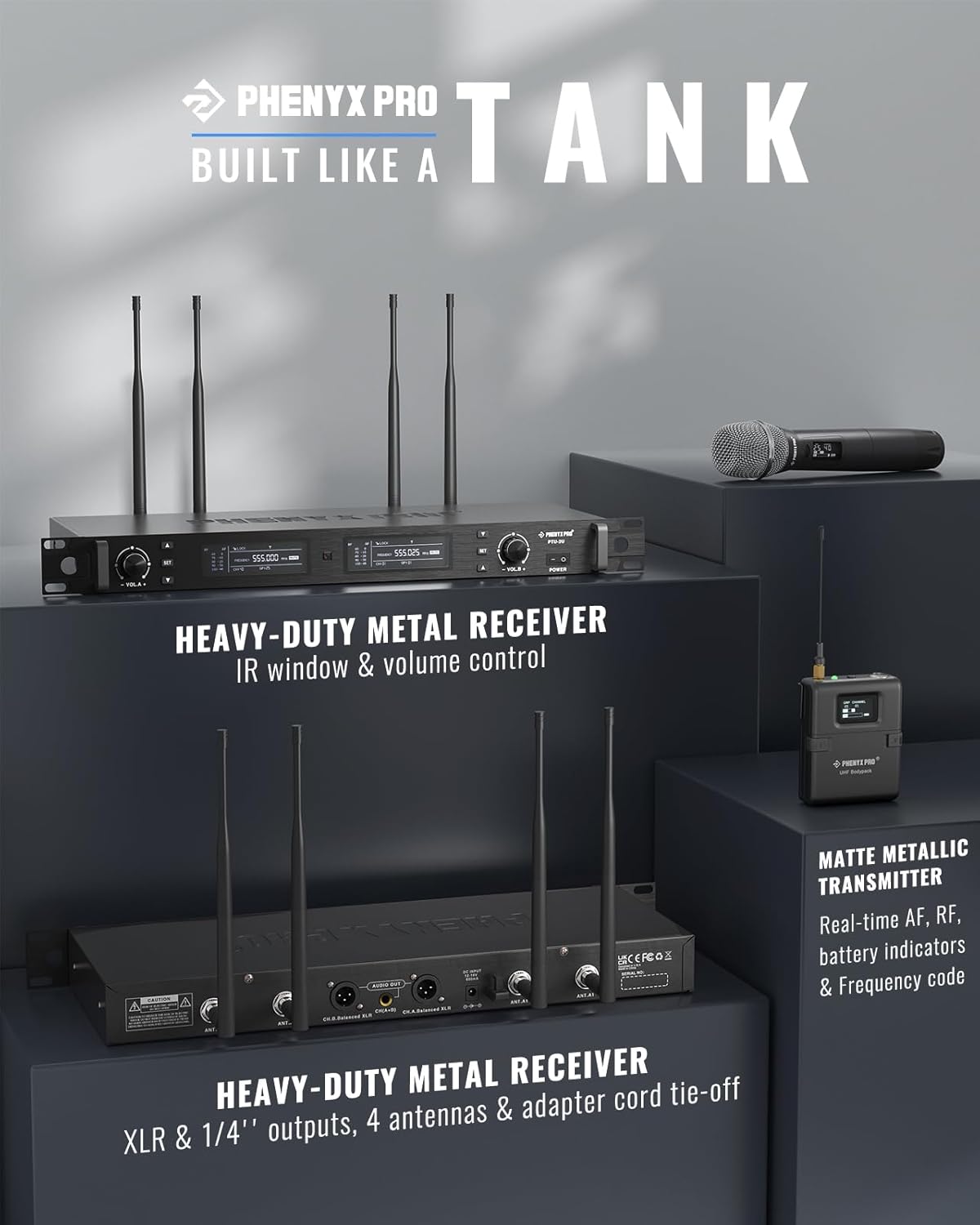 Phenyx Pro Wireless Microphone System, True Diversity Dual Cordless Microphone Set w/UHF Handheld/Bodypack/Headset/Lapel Mics, Auto Scan, 2x1000 Channels for Stage & Studio (PTU-2U-1H1B)