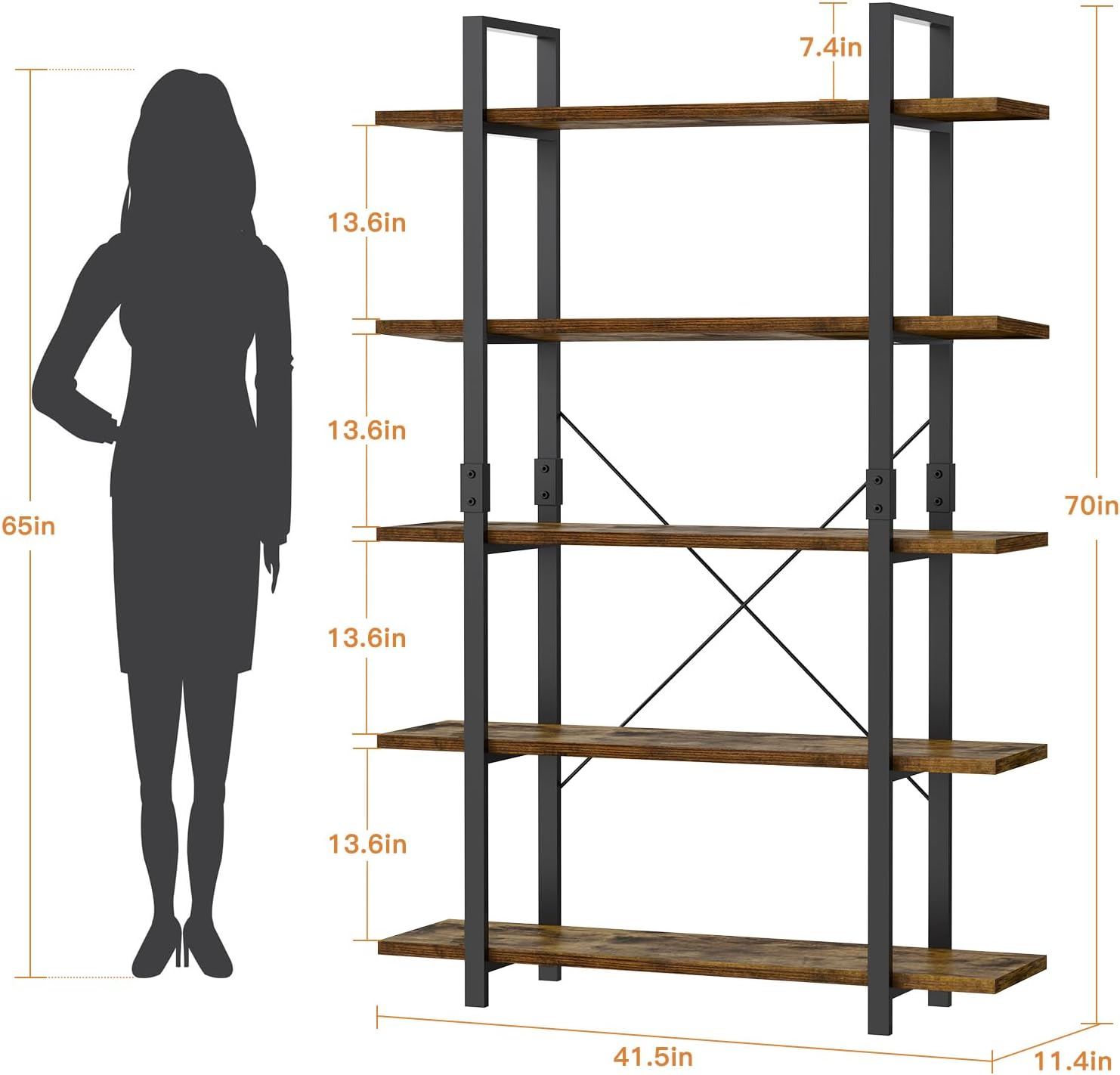 - Elegant & Open Design: burnished rustic brown MDF borad and black metal frame, the 5 tier rustic bookshelf looks graceful and luxurious and adds a refined touch to any space. Open shelves design with clean line structure maximize the open space feel. Rustic style makes it suitable for all your other furnitures