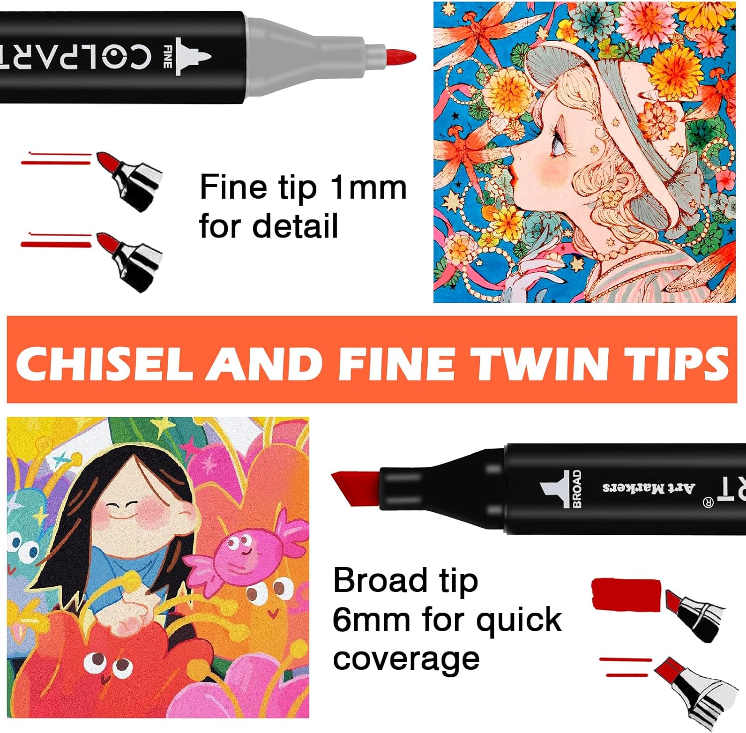 - 【Dual Tips Alcohol Markers】Dual Tips Art Markers Design allows you to make thick and thin lines without changing markers.Includes Fine tip 1mm and Broad tip 6mm twin tips for precise highlighting, sketching and underlining. Thin markers can be used to write and hook line while thick art markers professional are suitable for drawing and coloring book.
