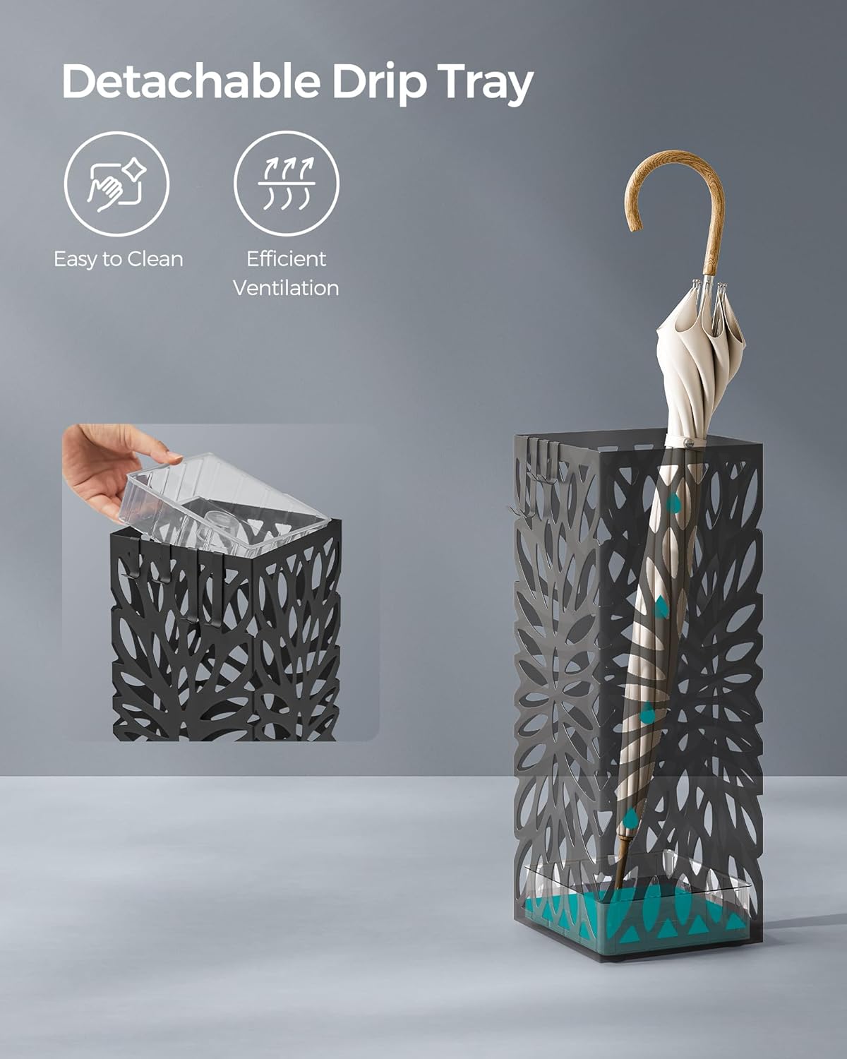 - [Convenient Details] Our metal umbrella holder offers added convenience with its detachable plastic drip tray and 4 removable hooks. These user-friendly features ensure easy cleaning and provide a practical solution for hanging fold-up umbrellas