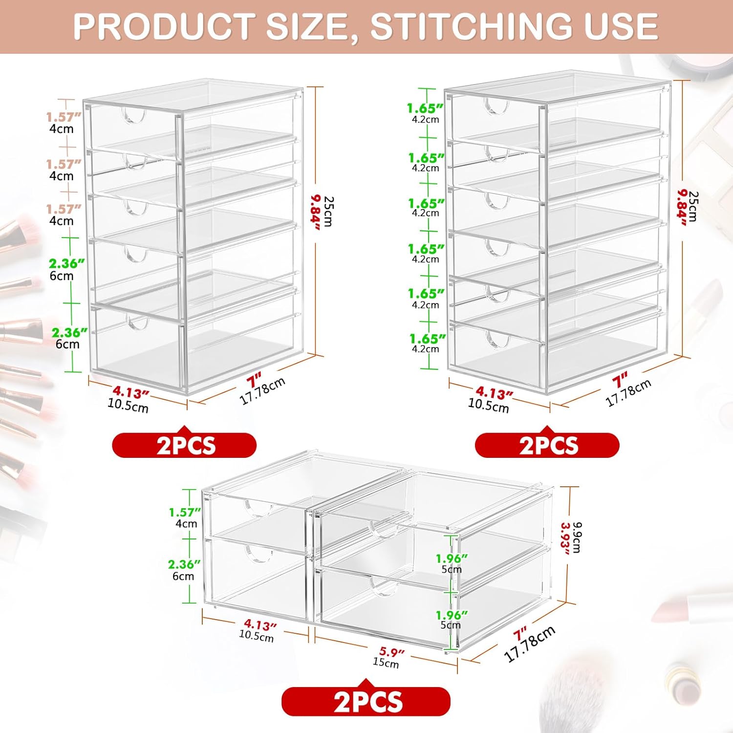 - 6 Pack Desk Organizers with 30 Drawers - This Maximize space on shelves, dressers ,under the sink,and bathroom counters. Total 30 drawers, itโs perfect to organize all your messy items into section, and very easy to take. You can also use them side by side, put your small objects on top of acrylic bins to make your countertop space more tidy. And 6 pack drawer organziers are also enough for you to place in multiple places, very good value.