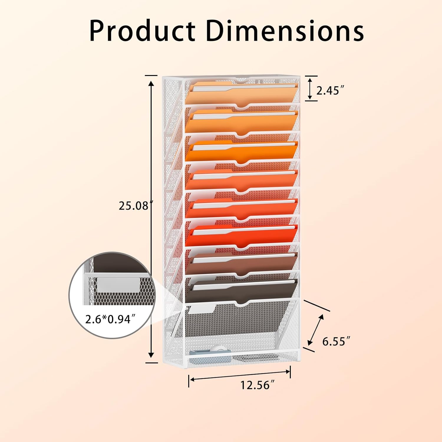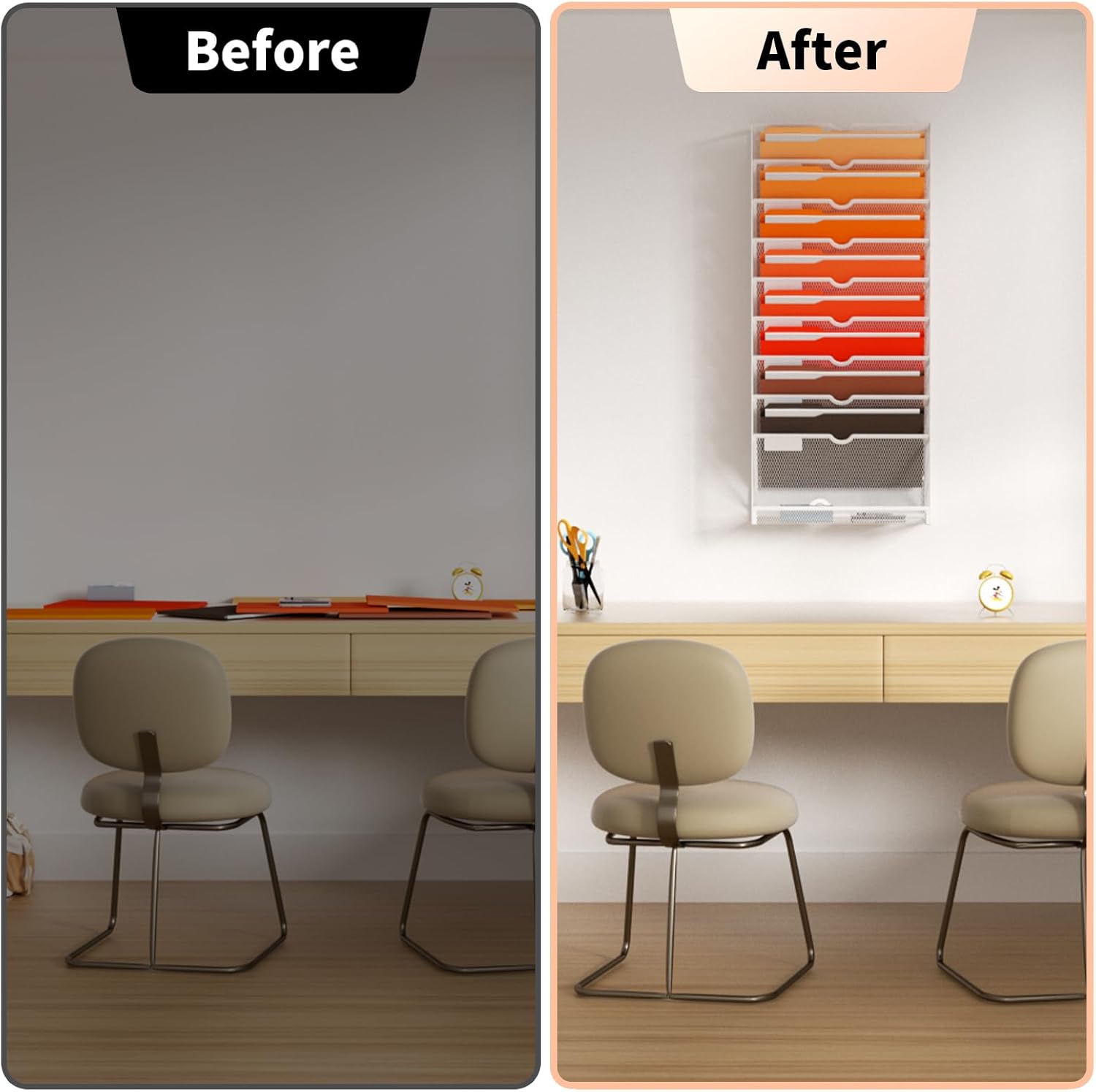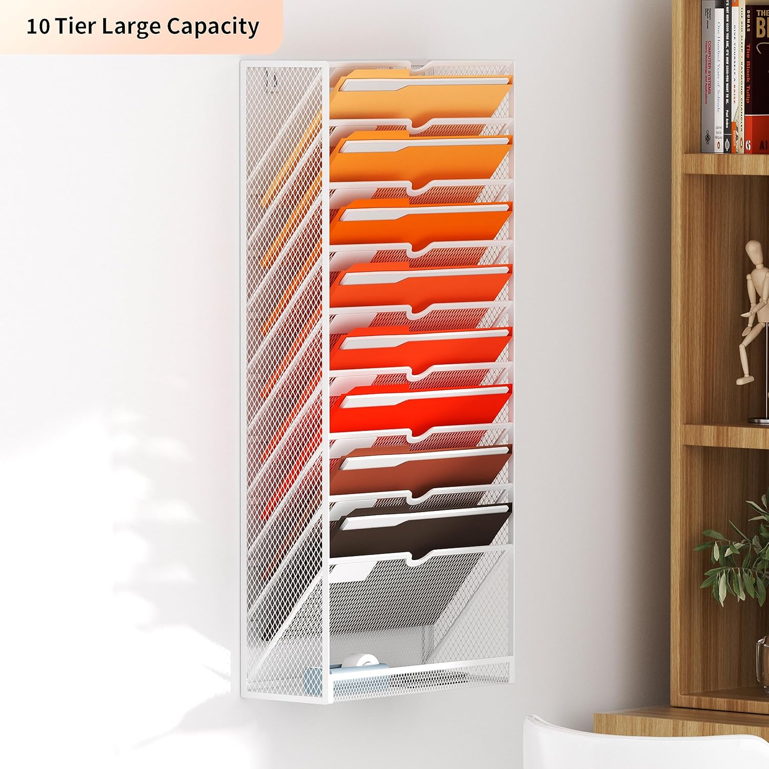 - 【Space Saveing】This wall file organizer has 10 separate cascading slots and has enough space to store your office stationery, such as holds letter-size charts and files, perfect for sorting organize notebooks, binders, file folders, literature, catalogs, mail, brochures, manilla envelopes and so on.