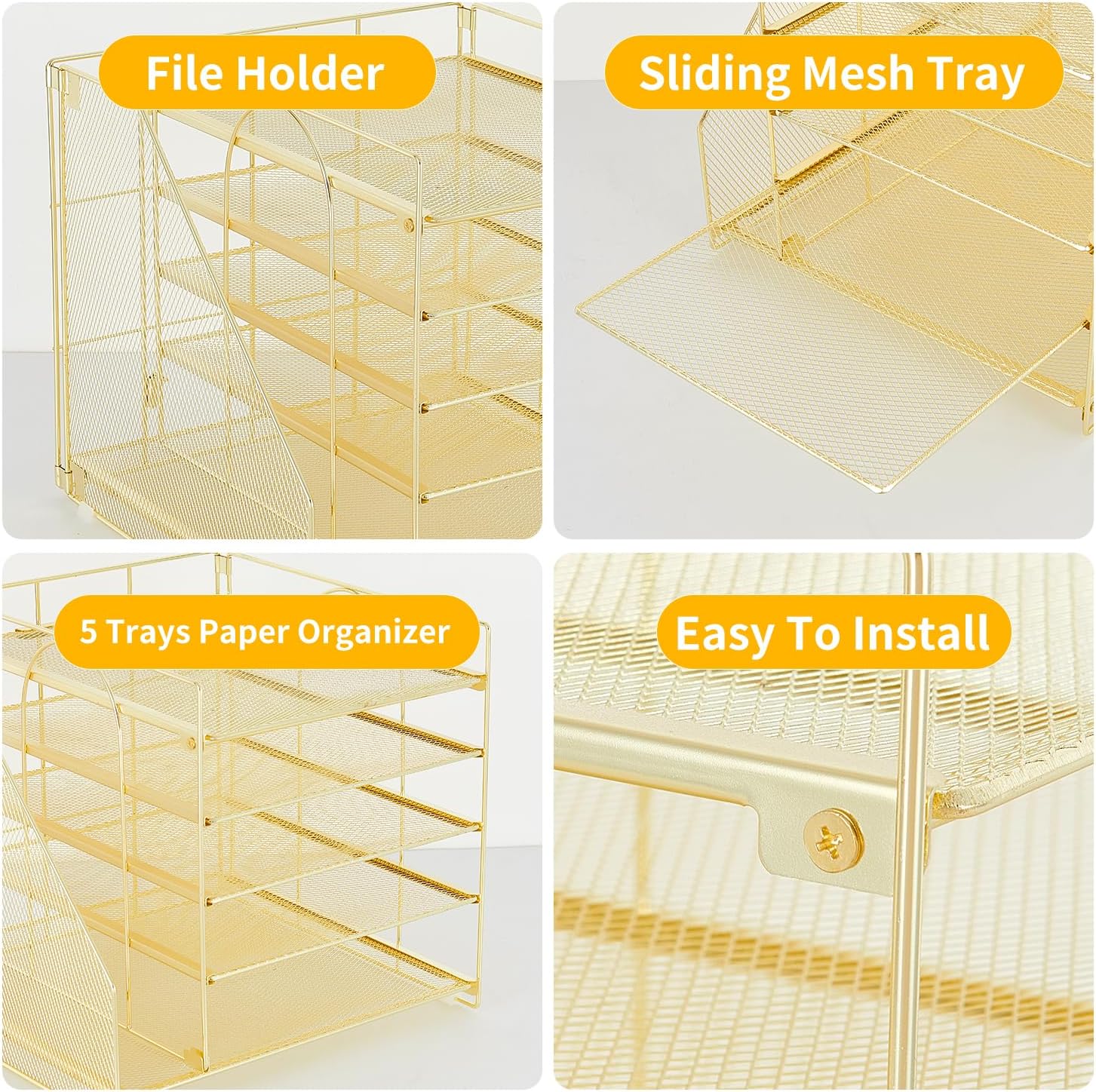 Desk Organizers and Accessories, 5-Tier Paper Letter Tray Organizer with File Holder, Desktop Organizer for Office Supplies, Office Desk Accessories & Workspace (Gold)