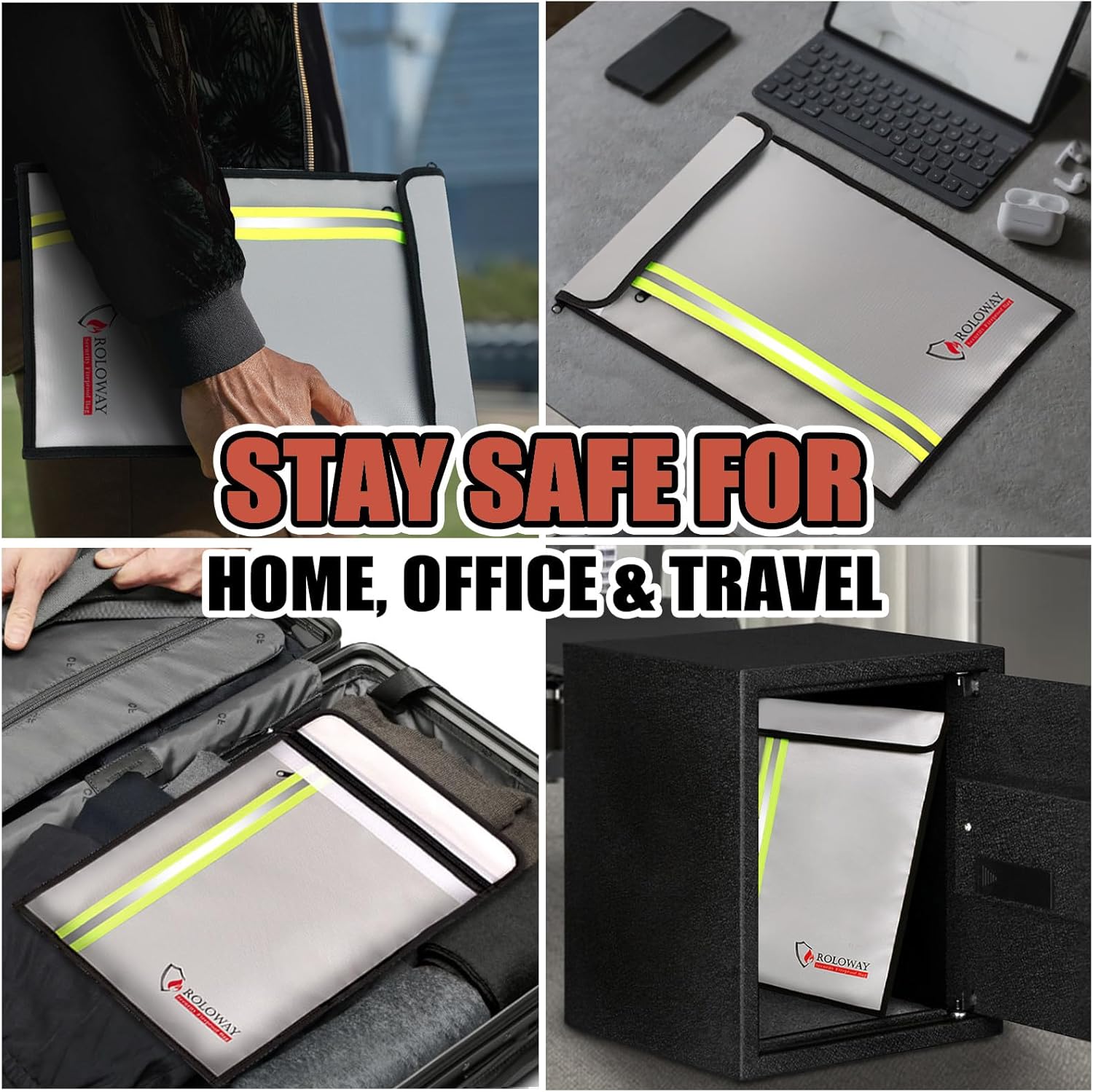 - [NIGHT REFLECTIVE STRIP DESIGN]: In emergencies, time is of the essence. Our fireproof money bag for cash features a Reflective Strip for quick and easy access, even in the dark. The high visibility design ensures faster retrieval of your valuables, making our fire document storage ideal for a Grab & Go. With water-resistant, NON-ITCHY SILICONE COATED FIBERGLASS, and a PORTABLE DESIGN, our document bag fireproof offers unmatched convenience for home, office, or travel.