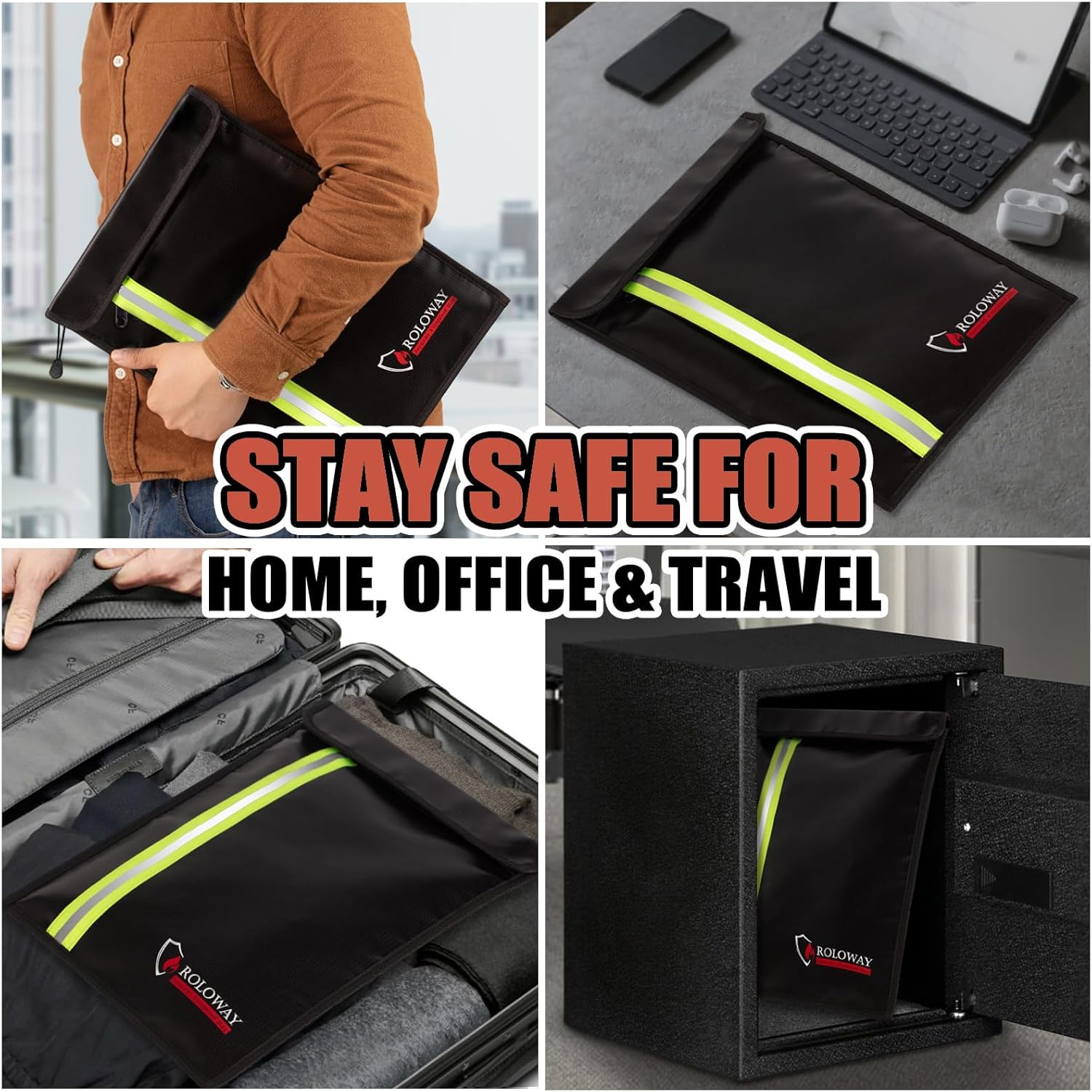 - [NIGHT REFLECTIVE STRIP DESIGN]: In emergencies, time is of the essence. Our fireproof money bag for cash features a Reflective Strip for quick and easy access, even in the dark. The high visibility design ensures faster retrieval of your valuables, making our fire document storage ideal for a Grab & Go. With water-resistant, NON-ITCHY SILICONE COATED FIBERGLASS, and a PORTABLE DESIGN, our document bag fireproof offers unmatched convenience for home, office, or travel.