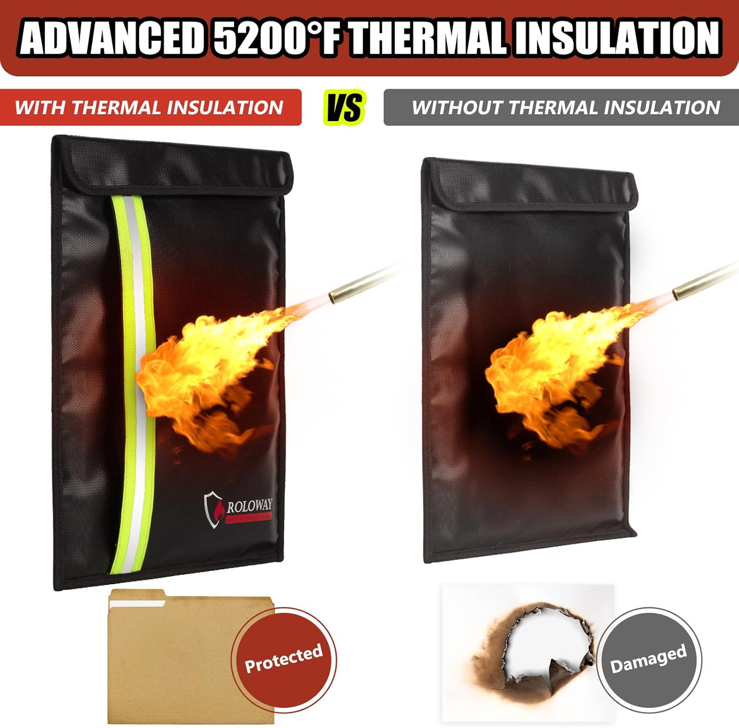 - [UPGRADED FIREPROOF DOCUMENT BAG – 5200°F HEAT INSULATED]: Our Upgraded Fireproof Bag is equipped with 10-LAYER Fire Resistant & Heat Insulation Structure. This fireproof document bag offers exceptional heat resistance, withstanding temperatures up to 5200°F for a certain period. Enhanced with silicone coating and secure hook & loop closure, it provides additional water resistance. Recommended by firefighters, this document safe fireproof bag ensures the safety of your valuables.