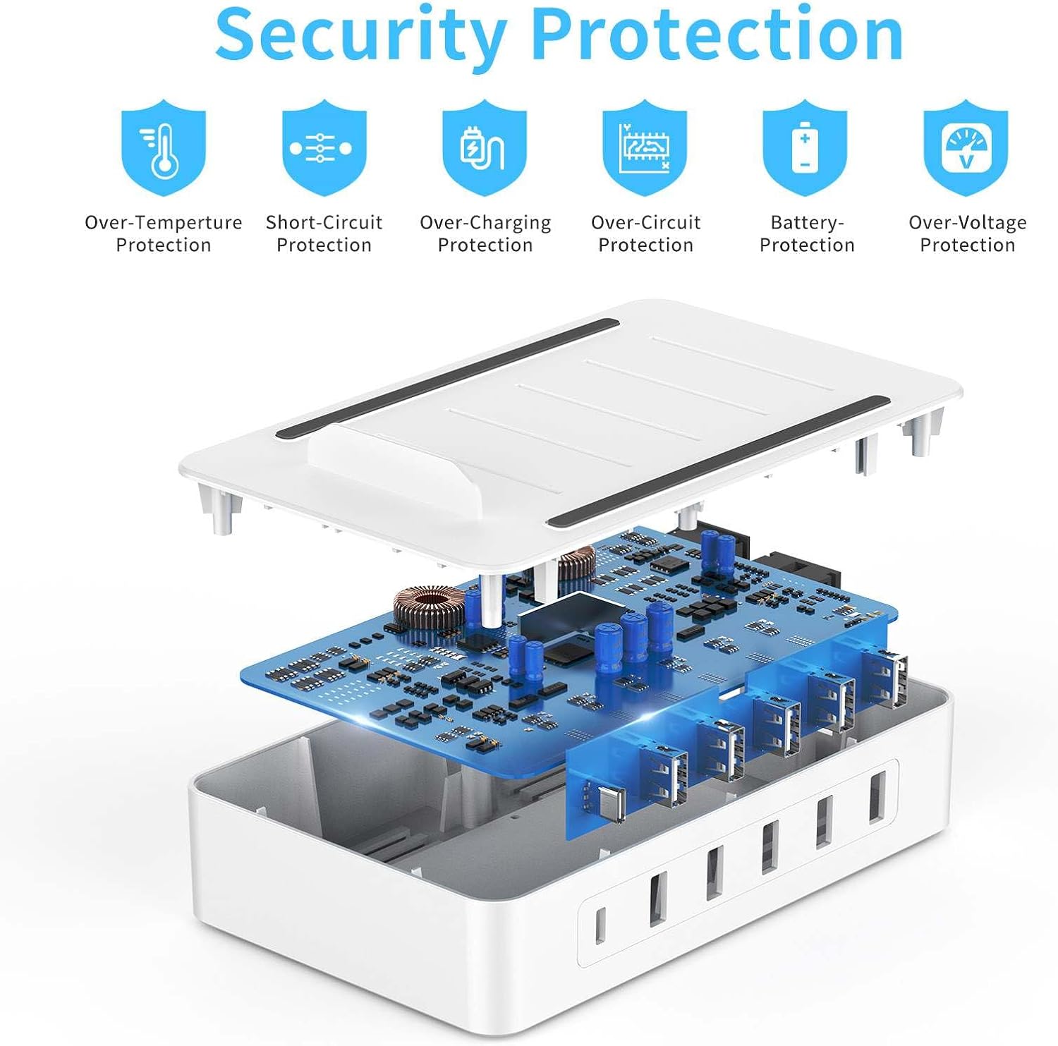 - âăSafety & Multi-Protection You Can TrustăYour devices are in good hands with our intelligent AI system, which identifies and distributes the required current for each device, ensuring stable and efficient charging. Moreover, the charging station comes with built-in over-current protection, over-charging protection, over-heat protection, short-circuit protection, battery protection, and over-voltage protection, giving you peace of mind while charging