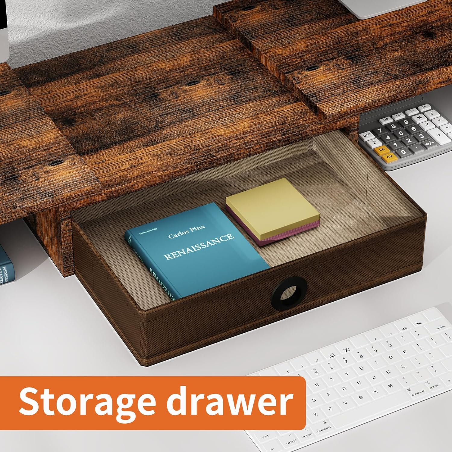 - Desktop Organizer with Drawer and Pen Slots: Our computer monitor stand comes with a drawer for storing sticky notes, writing utensils, files and notebooks. There are also two pen slots on both sides of the panel.
