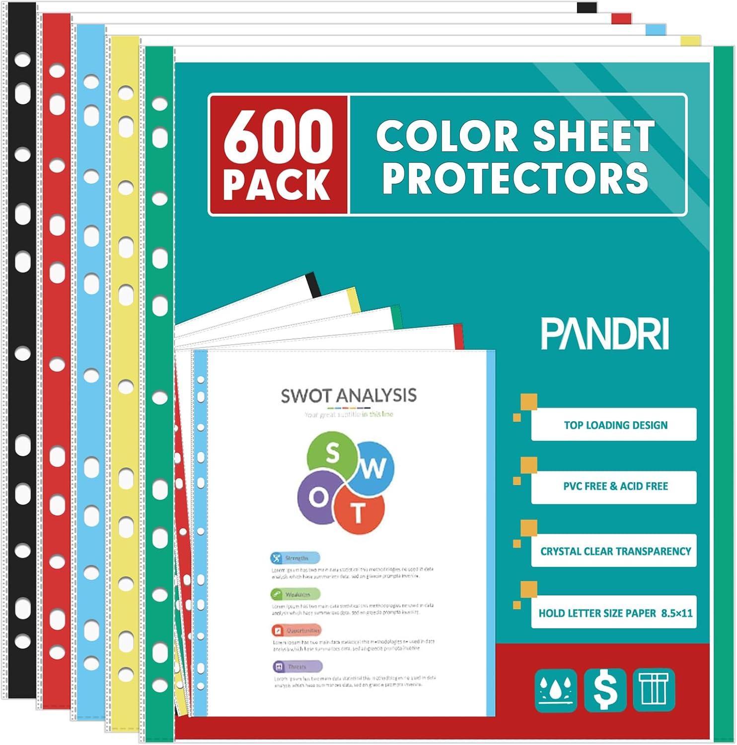 Sheet Protectors, PANDRI 600 Pack Color Heavy Duty Plastic Page Protectors Sheet Reinforced 11-Hole Fit for 3 Ring Binder Fits Standard 8.5 x 11 Paper, 9.25 x 11.25 Top Loaded, Excluding Acid