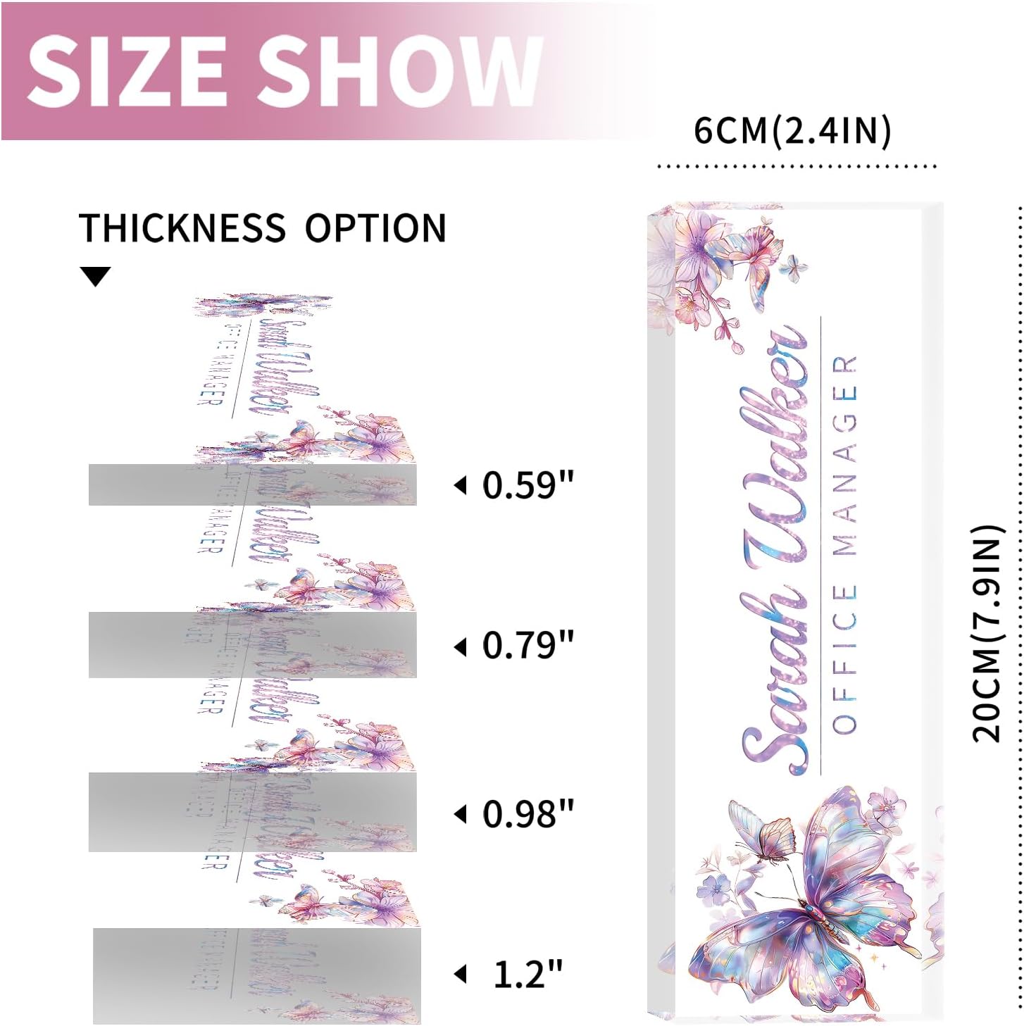 - 📏Various Styles And Sizes: We have hundreds of designs for you to choose from, whether it is for yourself or as a gift, you can find the right one. Professional designers design unique styles, and use high-quality acrylic materials to make them. There are also 4 thicknesses to choose from to meet all your needs. Acrylic nameplates are 8 inches long, 2.5 inches high, and 0.59/0.79/0.98/1.2 inches thick. Choose the one that suits you and light up your desk.