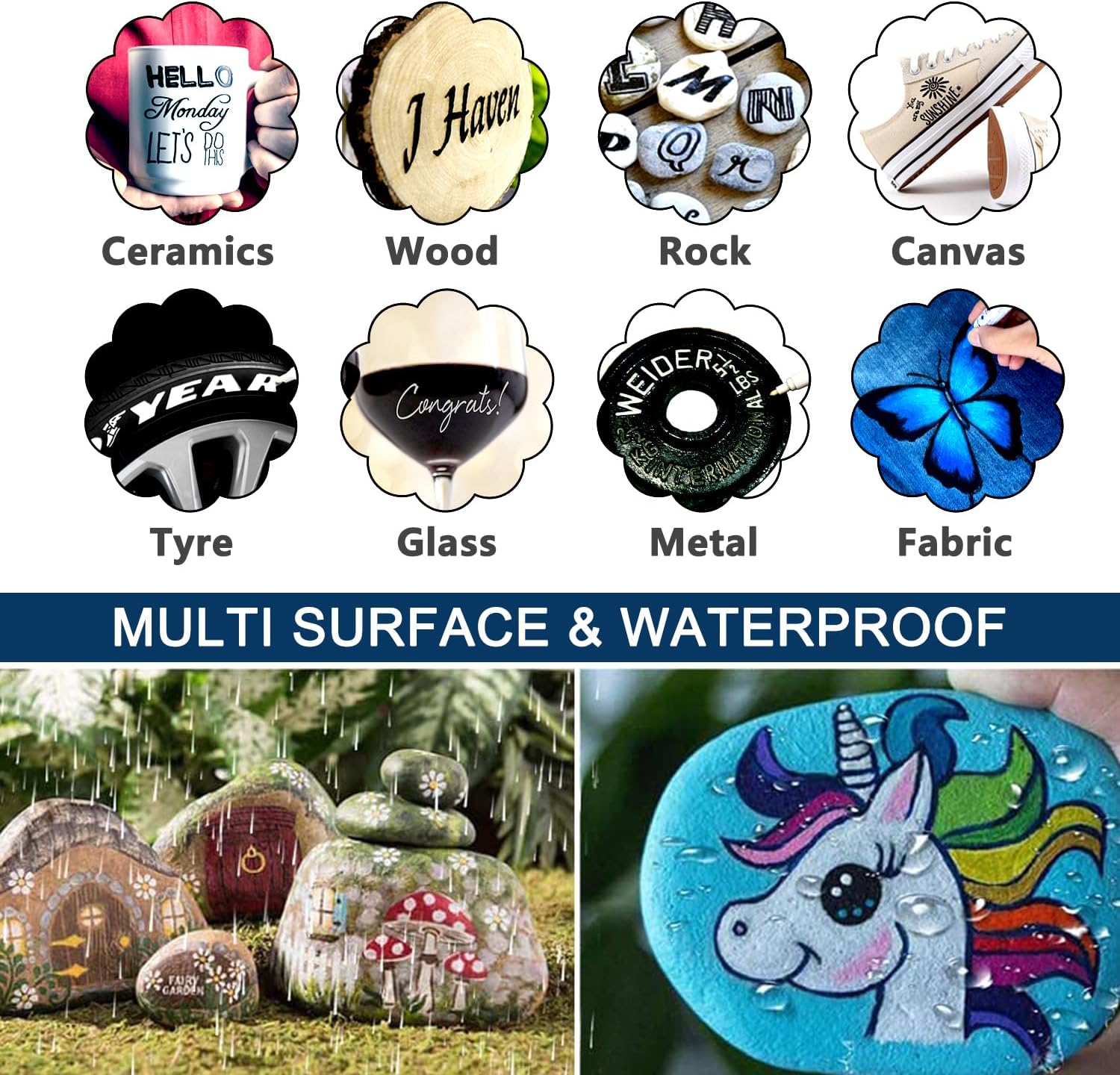 - Works on Almost any Surfaces: These permanent paint pen is the best choice to work on multiple surfaces. You can use on rock painting, ceramic, wood, leather, plastic, fabric, canvas, rubber, glass, metal and more