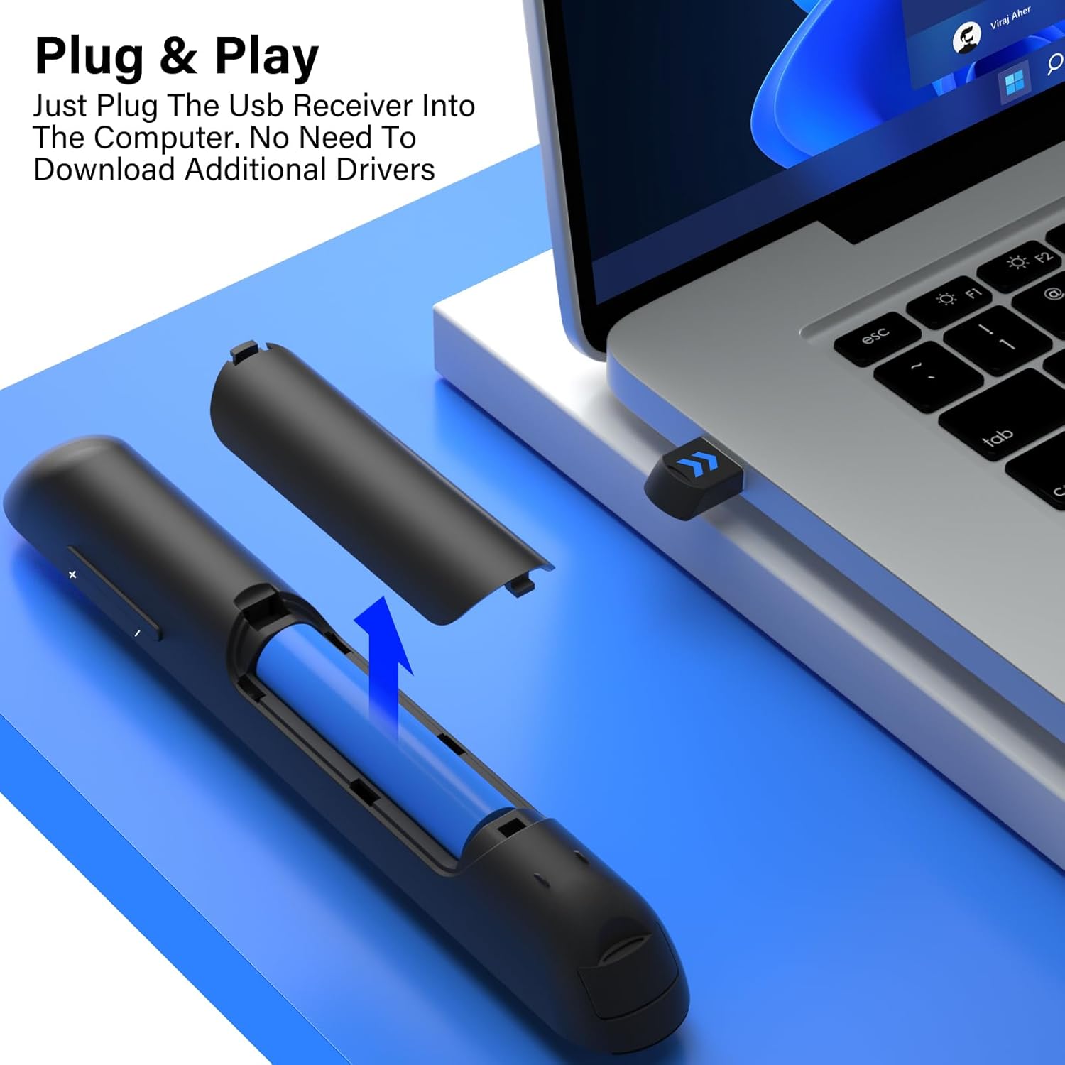 - PEN SIZE LASER POINTER: This presentation clicker features an Scientific ergonomic design, which make it comfortable to hold. Wireless presenter has a pen clip at the bottom, so you can clip the clicker to your shirt pocket, folder or textbook. Package Include: presenter clicker with USB receiver x 1,user manual x 1. (AAA Battery Not Included). please to contact us if you need help or loss USB receiver