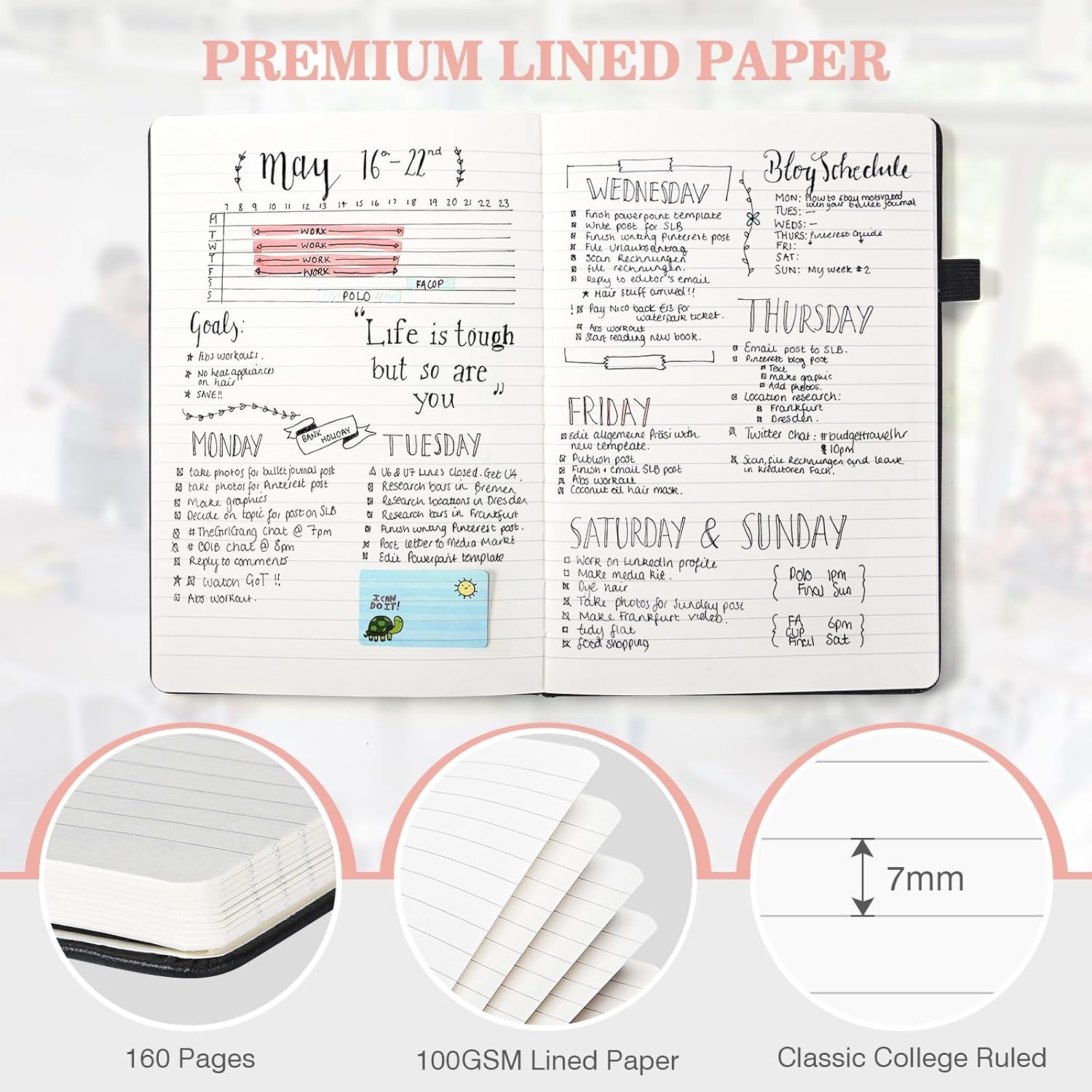 - 【Premium Writing Experience】These lined journals boast 100GSM paper with 80 sheets (160 pages). The paper is compatible with a wide range of pens, ensuring a seamless writing performance without any ink bleed-through. The 7mm line spacing is suitable for most people's writing preferences. Additionally, the pages can lay flat at 180°, allowing for easy note-taking. Ideal for school, office, outdoor activities, and travel.