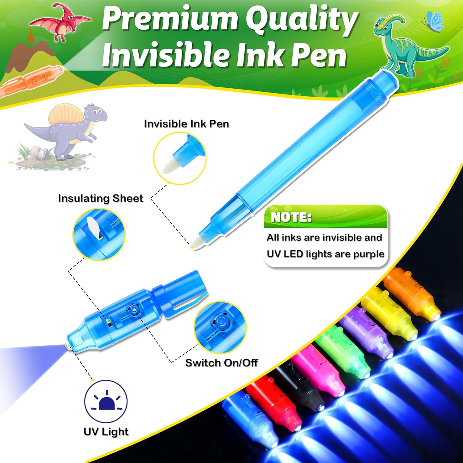 - Creative Invisible Ink Pen - Elevate your kids' creativity and fun with this amazing invisible ink pen! Kids can write their secret messages on paper using this magic pen, which can only be discovered by shining the pen's UV light on them! This dinosaur invisible pen set is the perfect addition to your child's spy games at home, providing countless moments of fun and imagination.