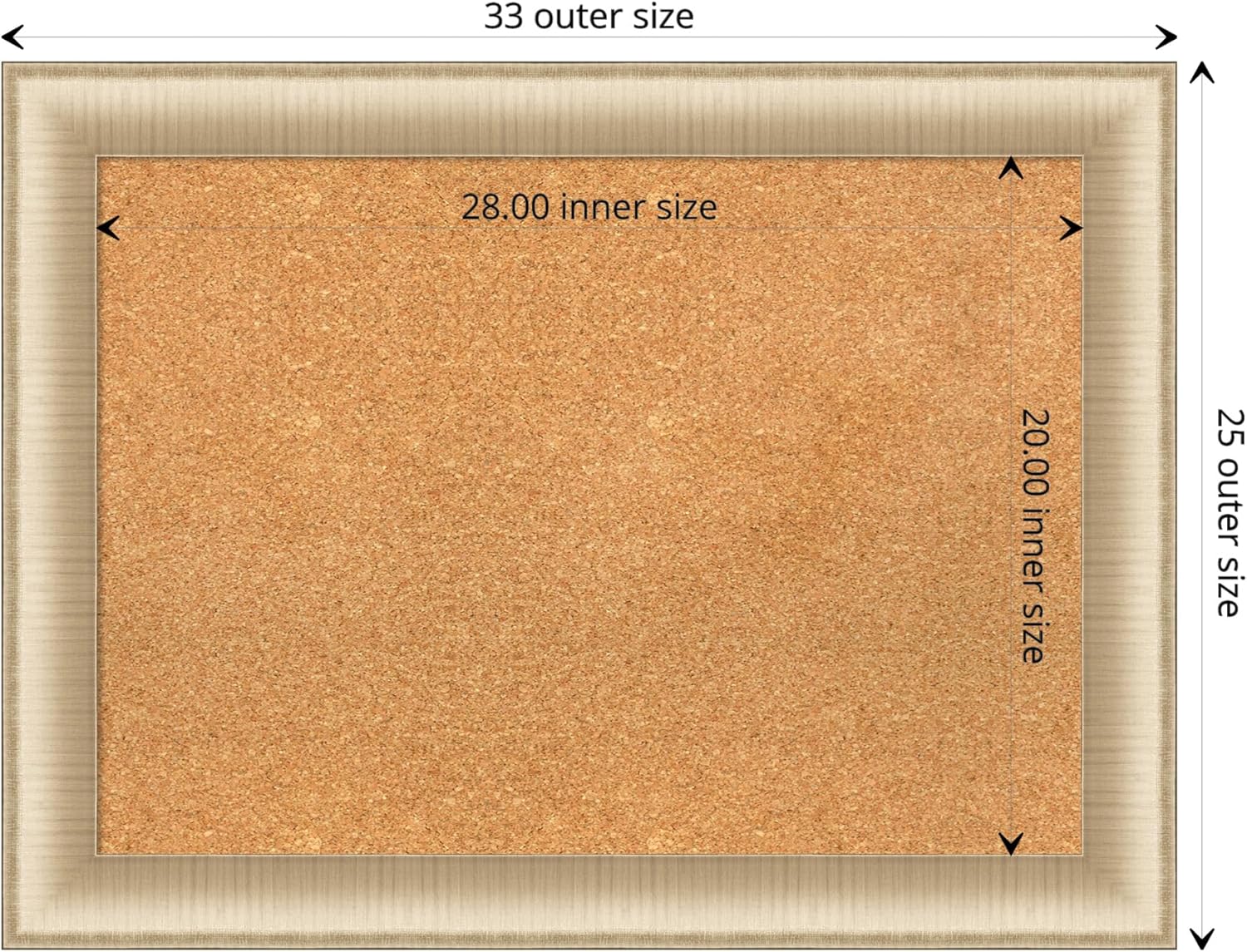 - DIMENSIONS: The overall size of this framed cork board measures 33 in. x 25 in., including the frame. Its functional cork board area measures 28 in. x 20 in.