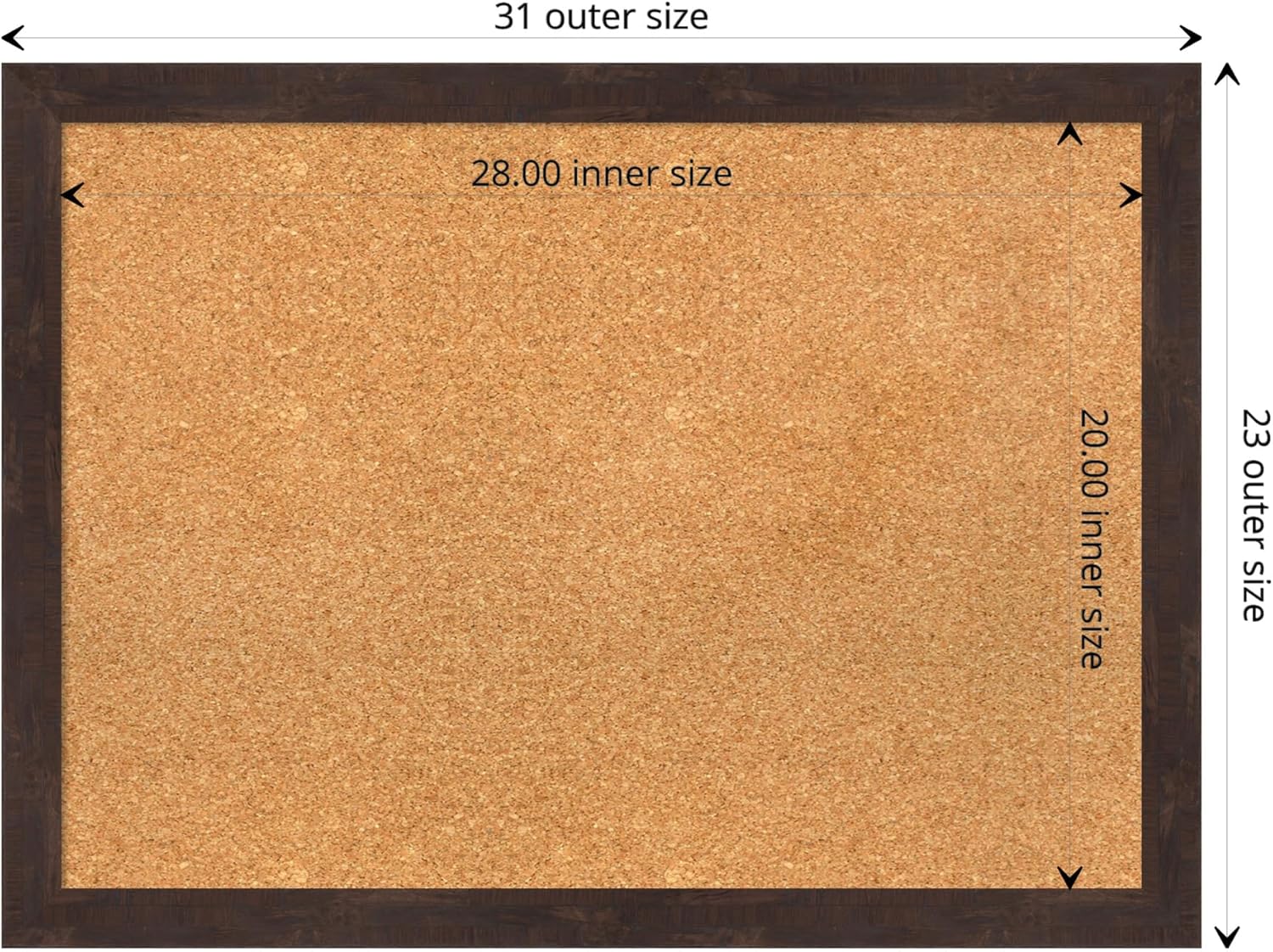 - DIMENSIONS: The overall size of this framed corkboard measures 31 in. x 23 in., including the frame. Its functional cork board area measures 28 in. x 20 in.