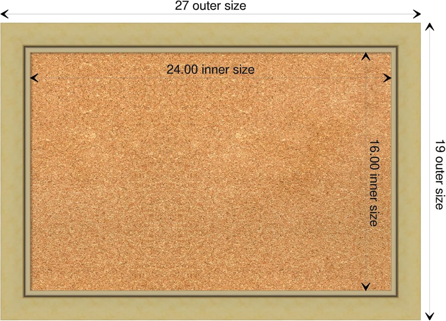 - DIMENSIONS: The overall size of this framed cork board measures 27 in. x 19 in., including the frame. Its functional cork board area measures 24 in. x 16 in.