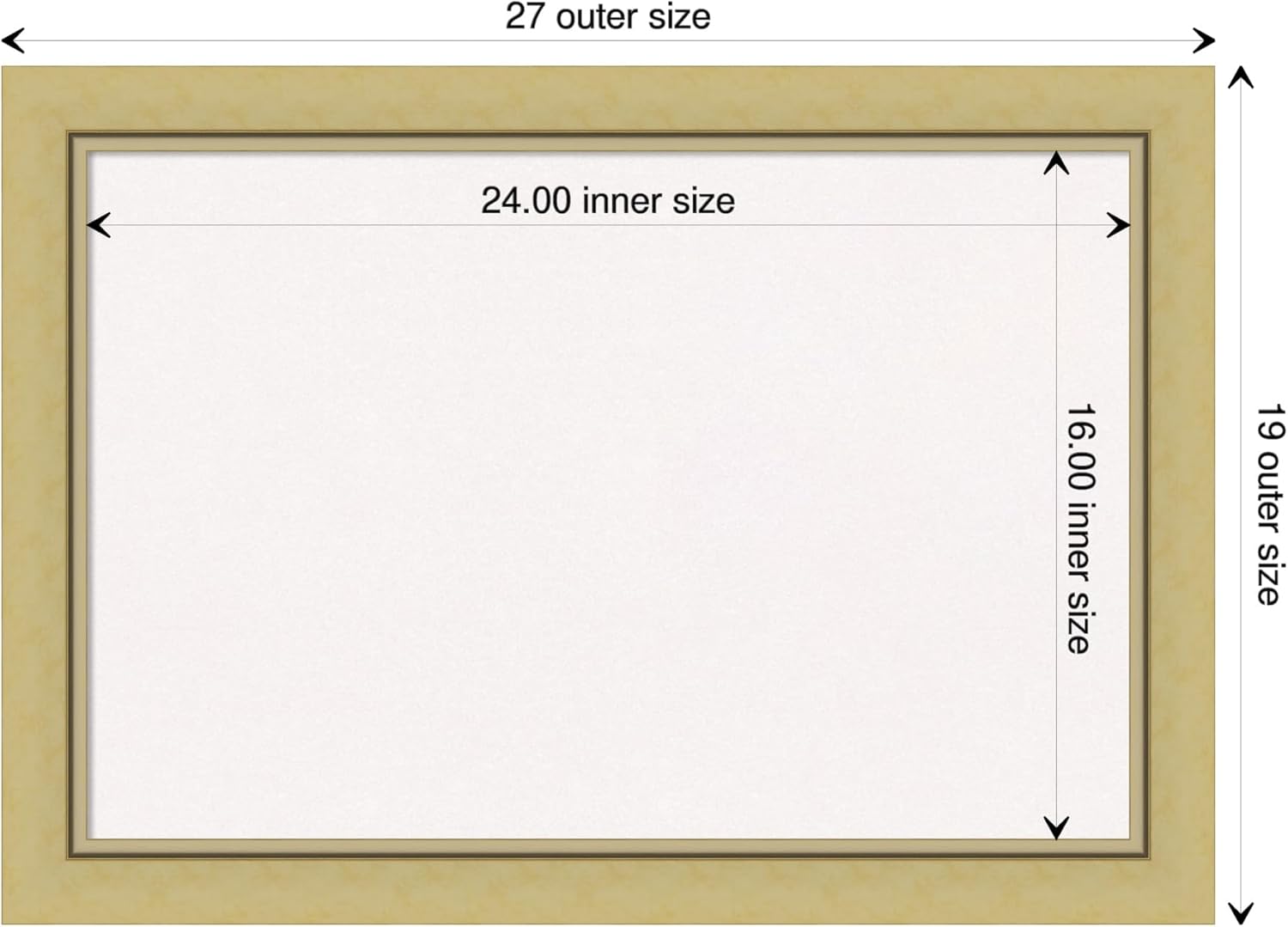 - DIMENSIONS: The overall size of this framed cork board measures 27 in. x 19 in., including the frame. Its functional cork board area measures 24 in. x 16 in.