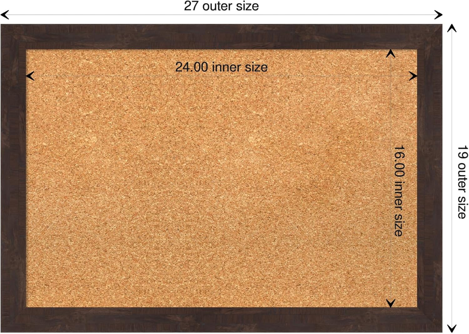 - DIMENSIONS: The overall size of this framed corkboard measures 27 in. x 19 in., including the frame. Its functional cork board area measures 24 in. x 16 in.