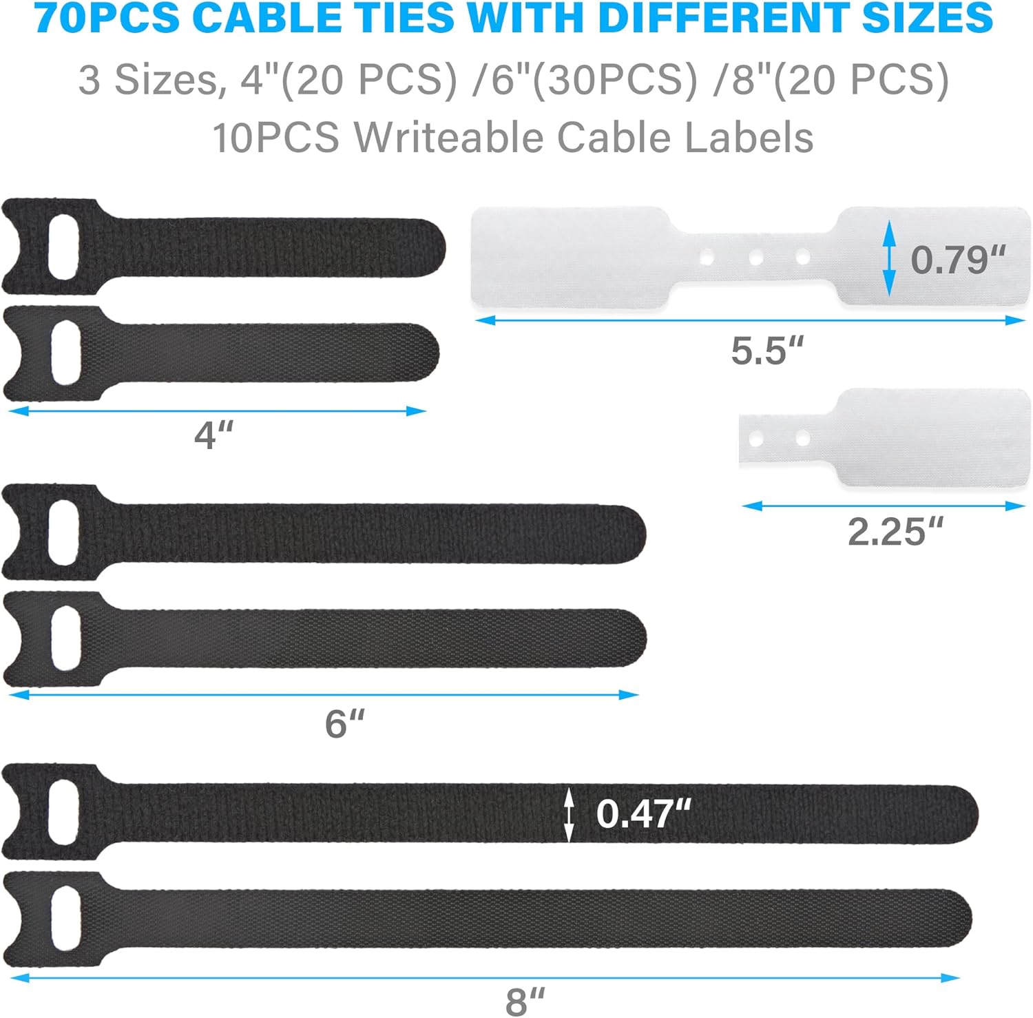 70 PCS Reusable Cable Ties with Hook and Loop, Multi-purpose Adjustable Cable Management Wire Ties & 10 PCS Cable Labels, Cord Organizer for Home, Office and Data Centers (4/6/8 Inch, Black+Grey)