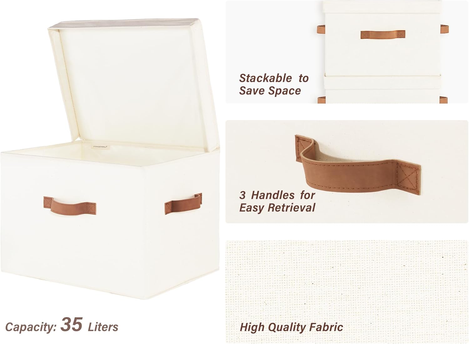 StorageWorks Fabric Storage Bins with Lid, Decorative Storage Boxes for Shelves, Stackable Closet Organizer Basket with Handles, Jumbo, Ivory White, 2-Pack