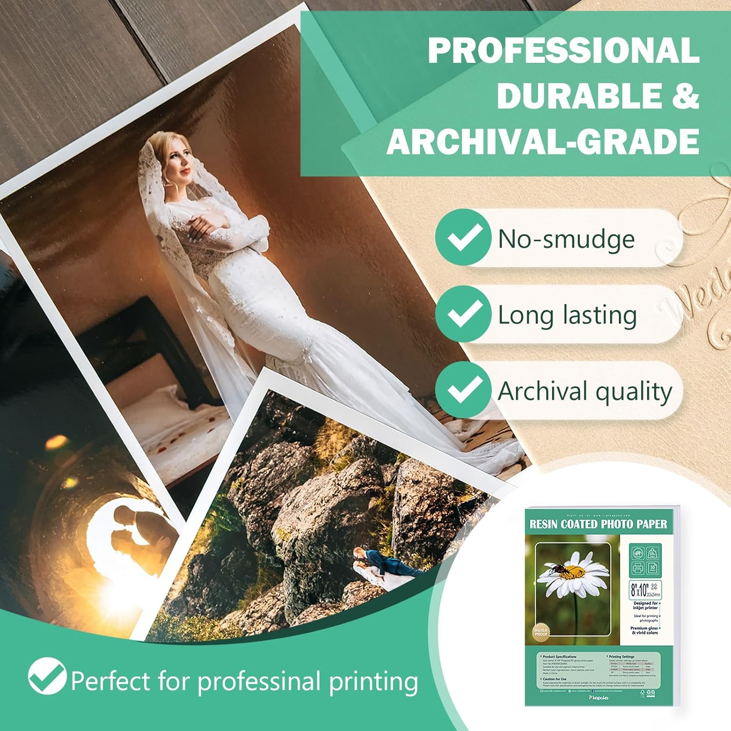 Ultra-Premium Glossy RC Photo Paper, Professional and Heavyweight Metallic Resin Coated Photo Paper, Pigment and Dye Inkjet Printer Suitable, Waterproof, 8x10, 50 Pack