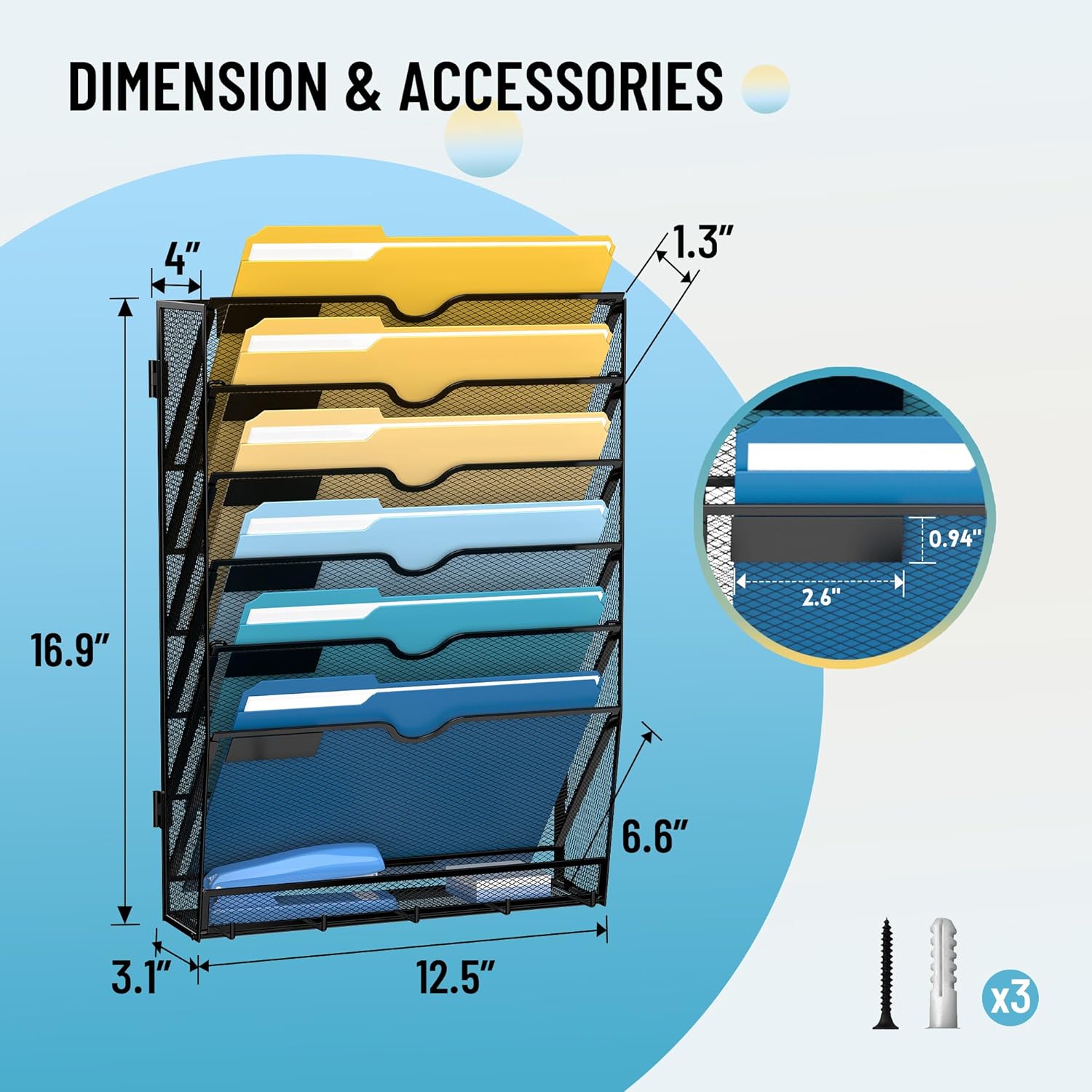- [6+1 Wall File Organizer] This hanging wall file organizer has 7 vertical pockets wall mounted file organizer with small label to classify your documents, you can store folders, magazines and paper in it. The 1 bottom flat tray is great for stationary, desk accessories.